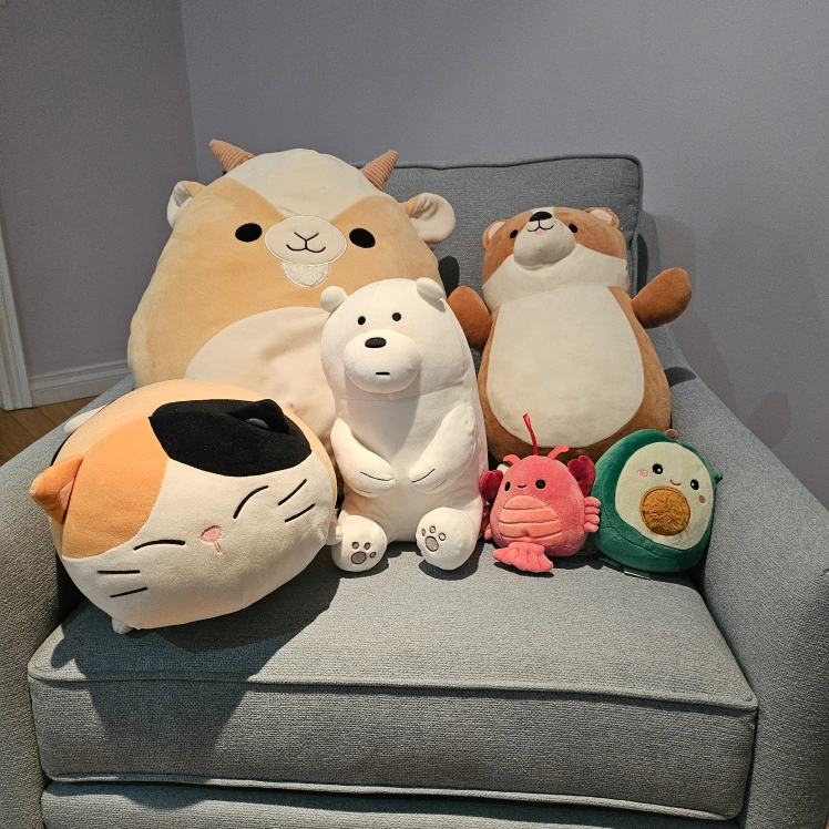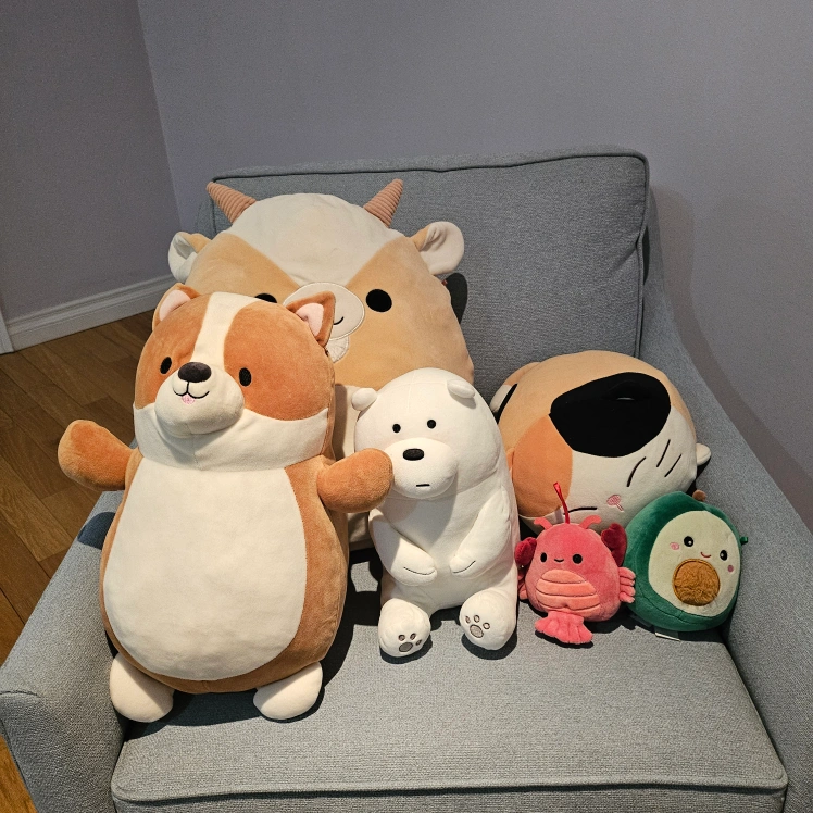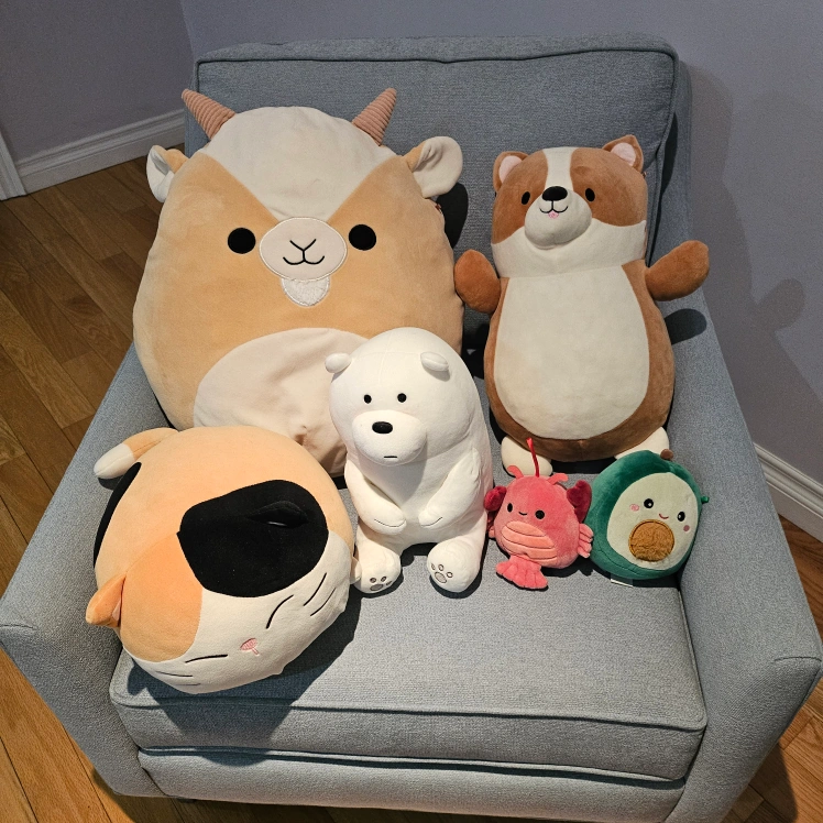 Giving away a collection of adorable plush toys! There's a variety of characters, including what looks like a cow, a corgi, a polar bear, a cat, a shrimp, and an avocado. They're all in great condition and ready for a new home!