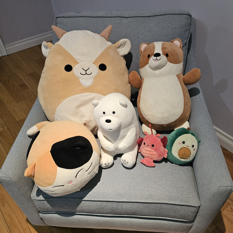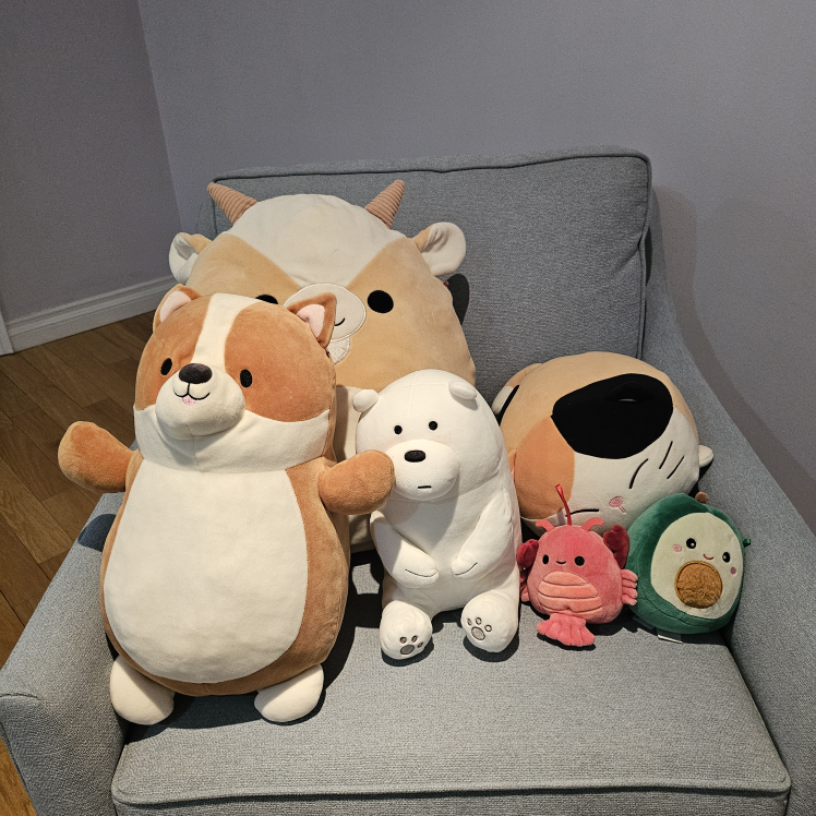 Giving away a collection of adorable plush toys! There's a variety of characters, including what looks like a cow, a corgi, a polar bear, a cat, a shrimp, and an avocado. They're all in great condition and ready for a new home!