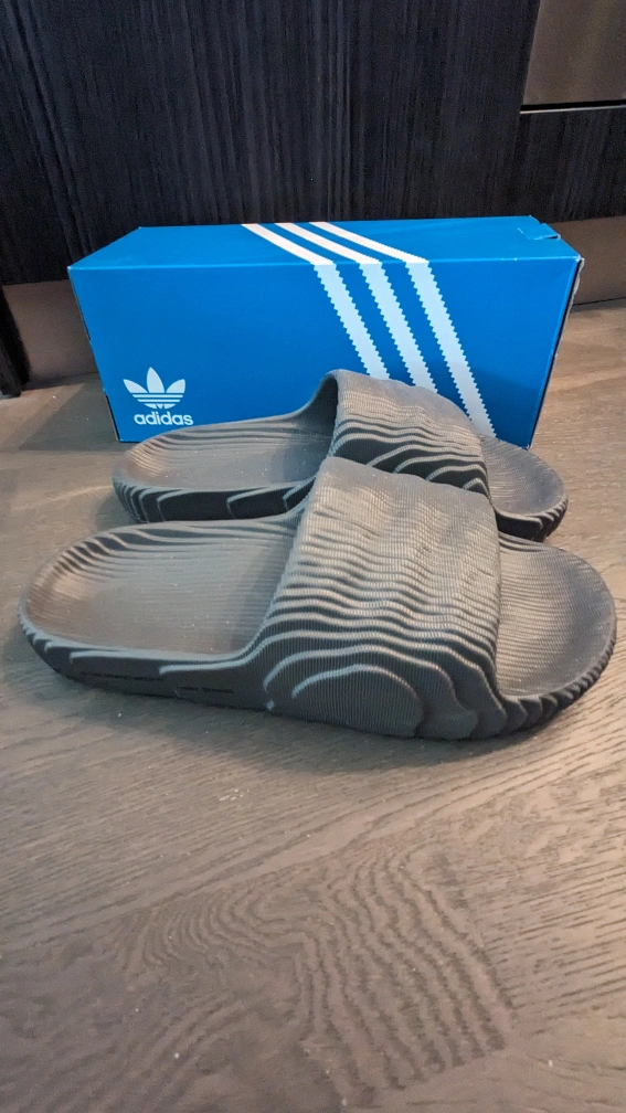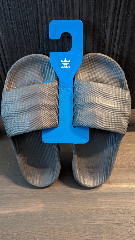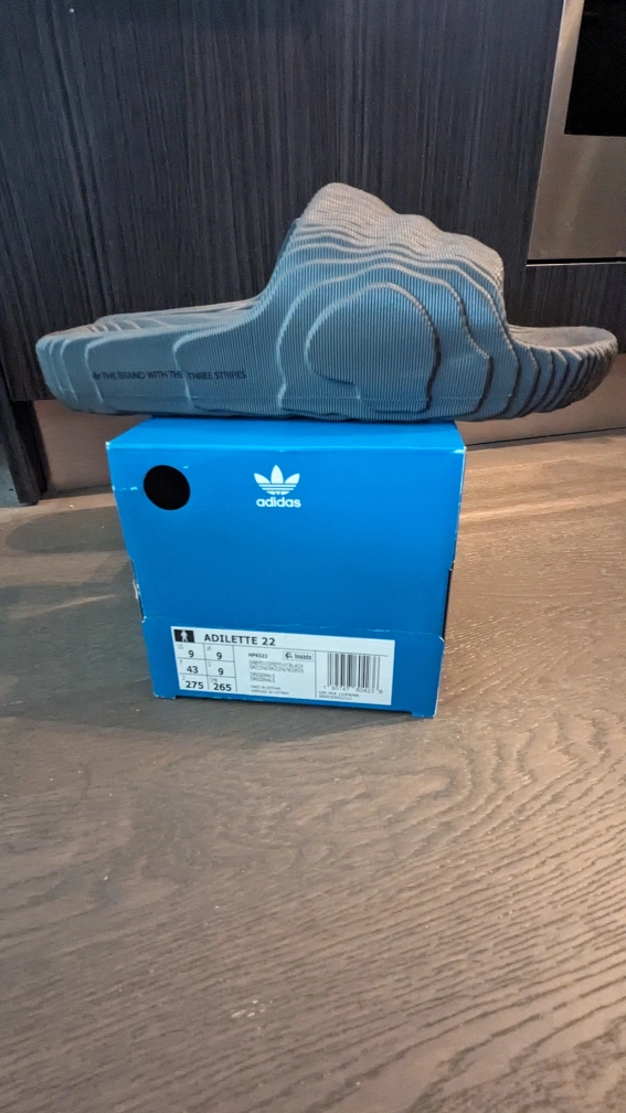 Brand new with box Adidas Adilette 22 in grey/core black colour way. US Men's 9 or Women's 10.5. Note these run long.