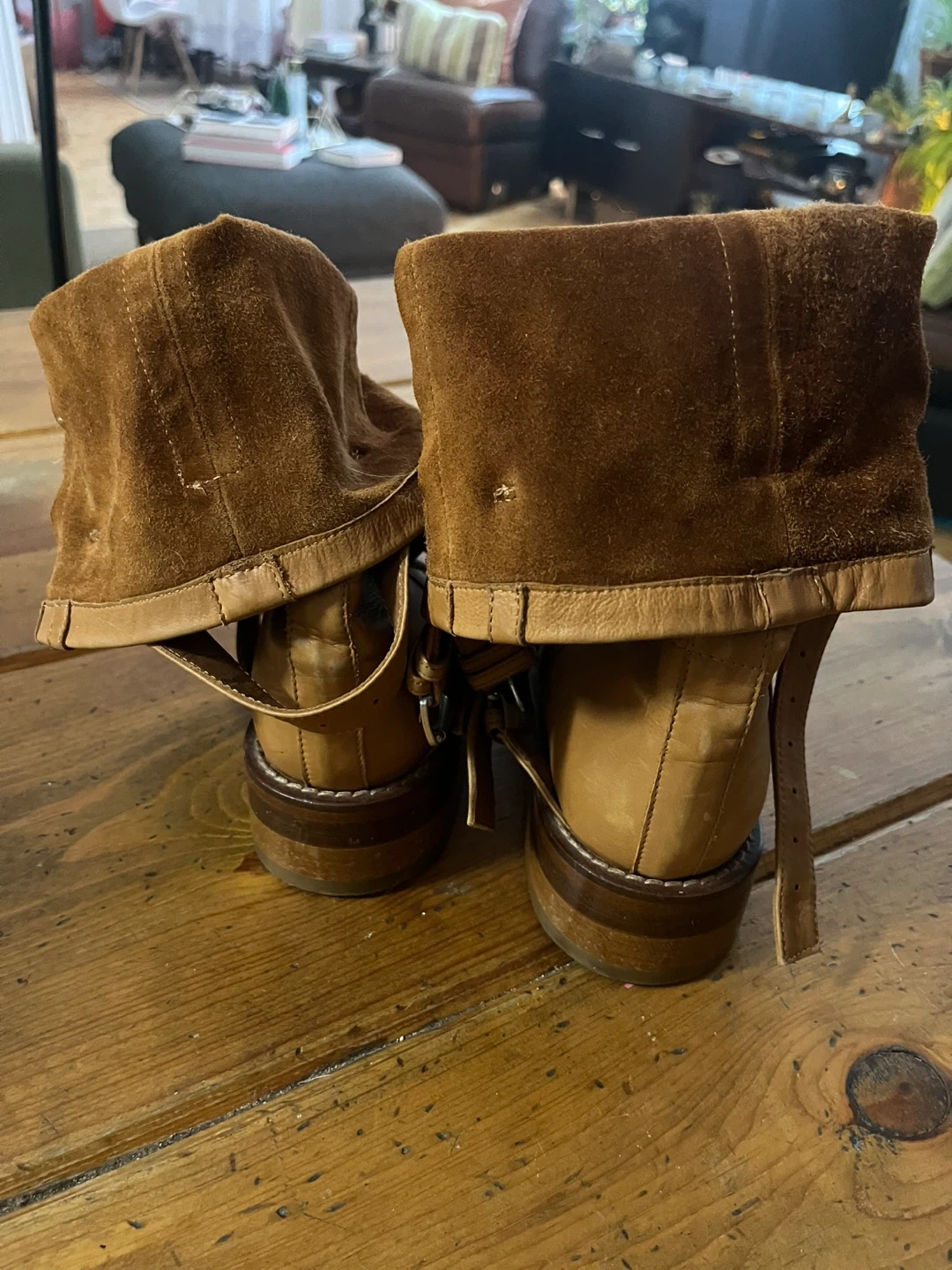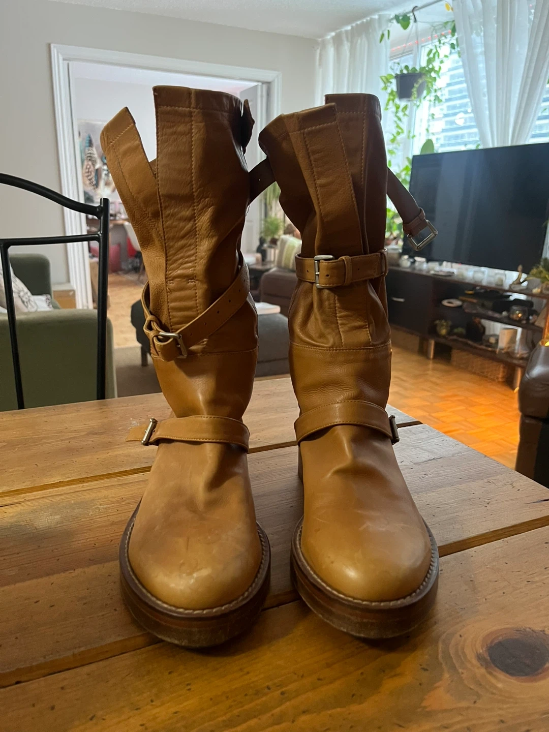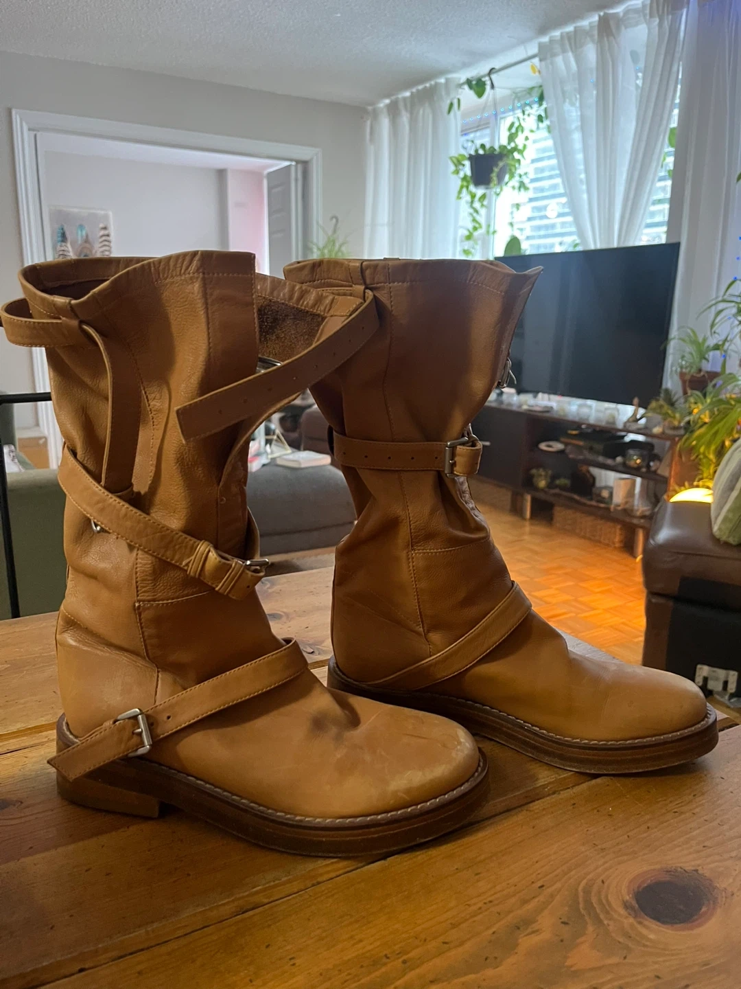 Selling a pair of vintage women’s Ann Demeulemeester leather riding boots in tan. They’re in great condition and have been hardly worn.
