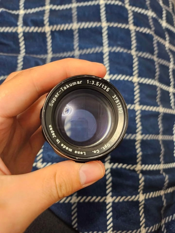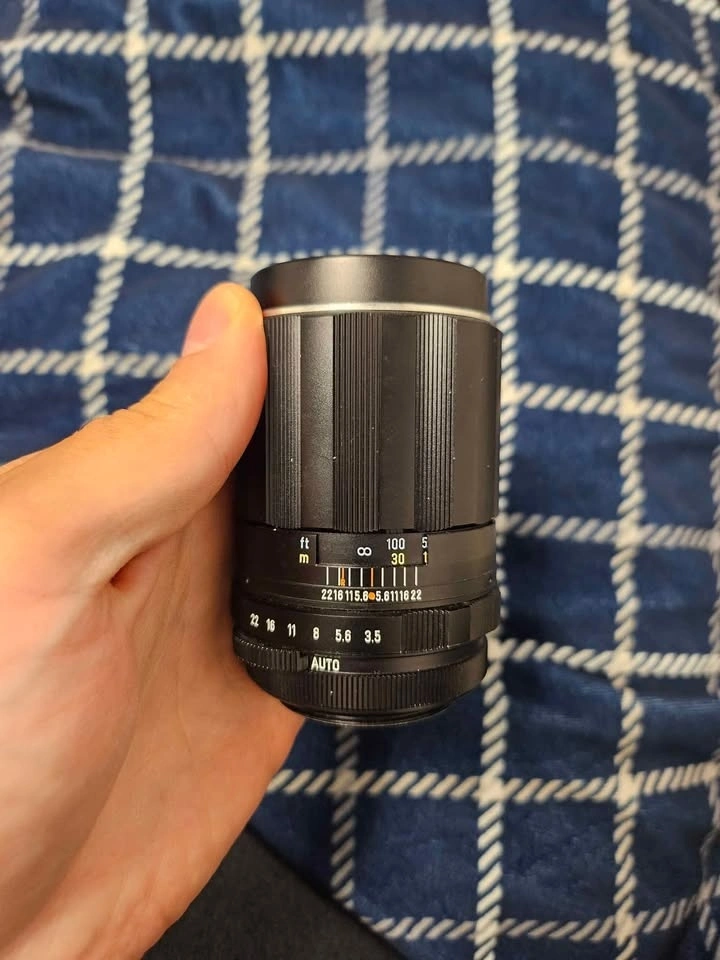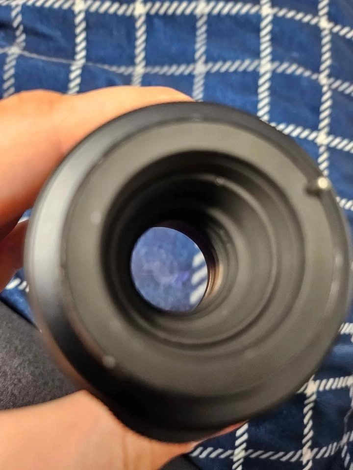 This lens has some dust in the elements and some light scratches on the front element. These do not impede image quality. No caps included.