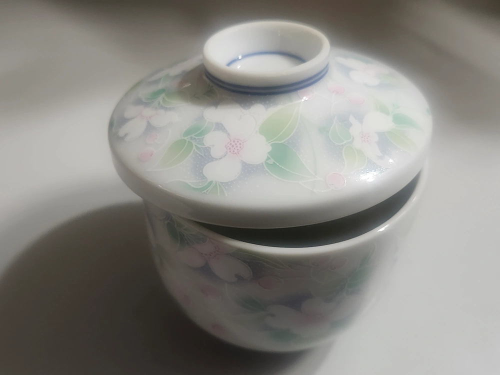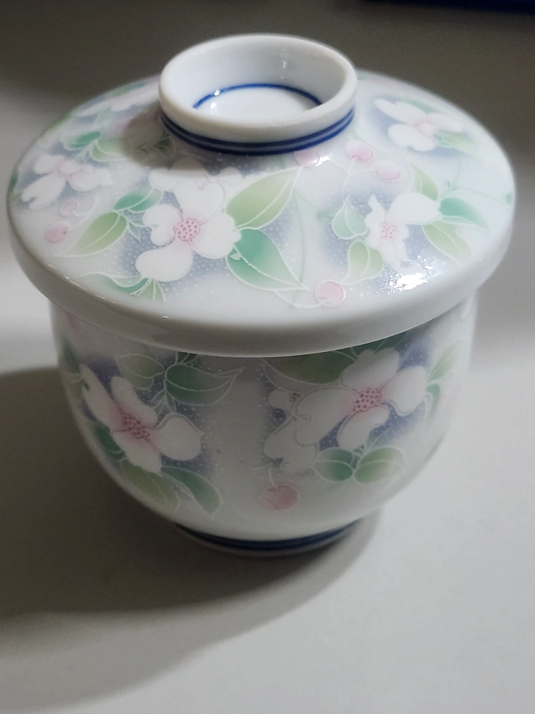 Selling a cute Japanese Chawanmushi cup with a lid! It has a lovely floral design in soft colours. Perfect for enjoying a savoury egg custard or other small dishes. It's in great condition and ready for a new home.