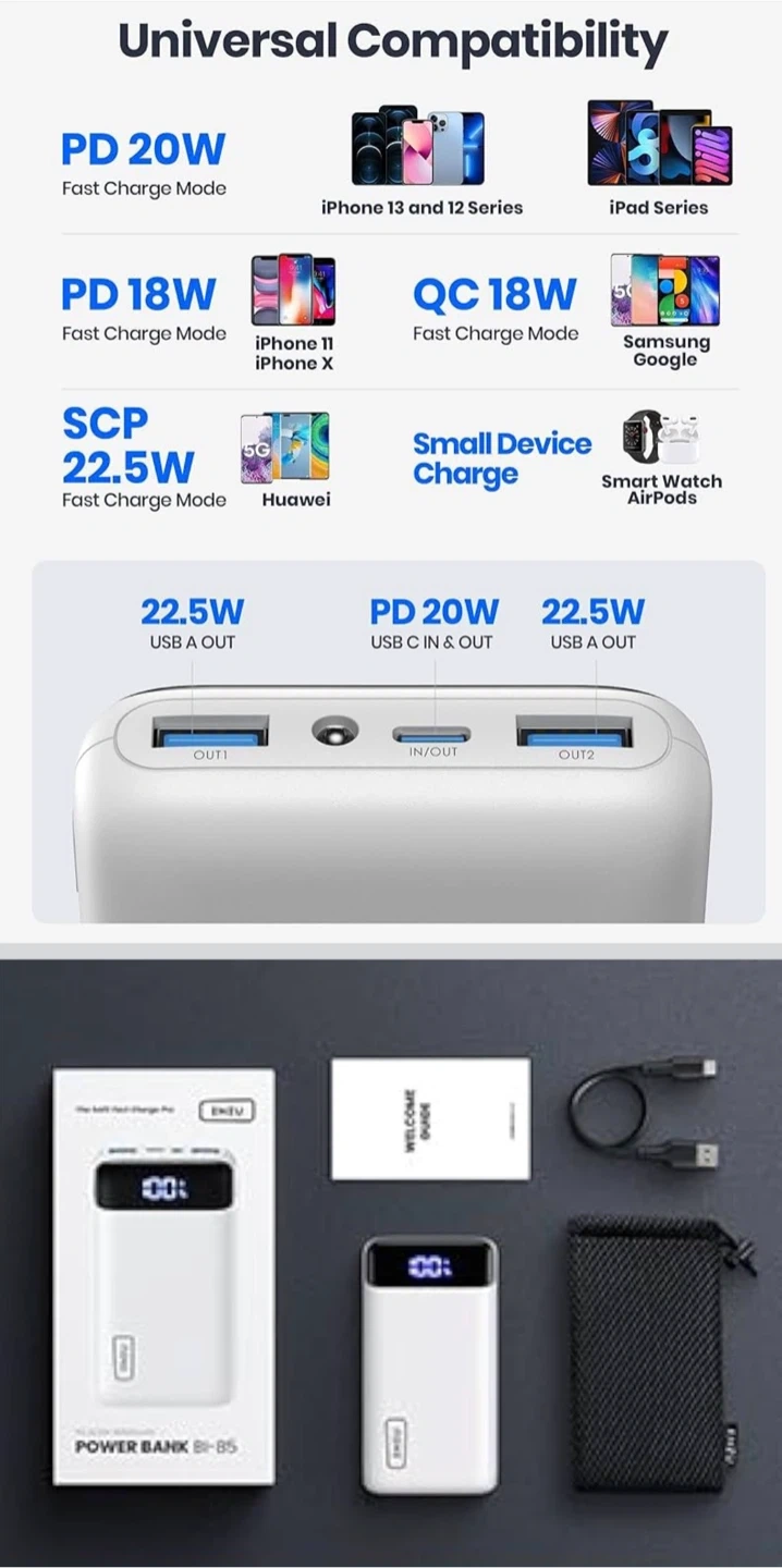 This INIU power bank offers 20000mAh capacity with PD 22.5W fast charging. It features USB-A and USB-C ports for universal compatibility. Includes a pouch and charging cable.