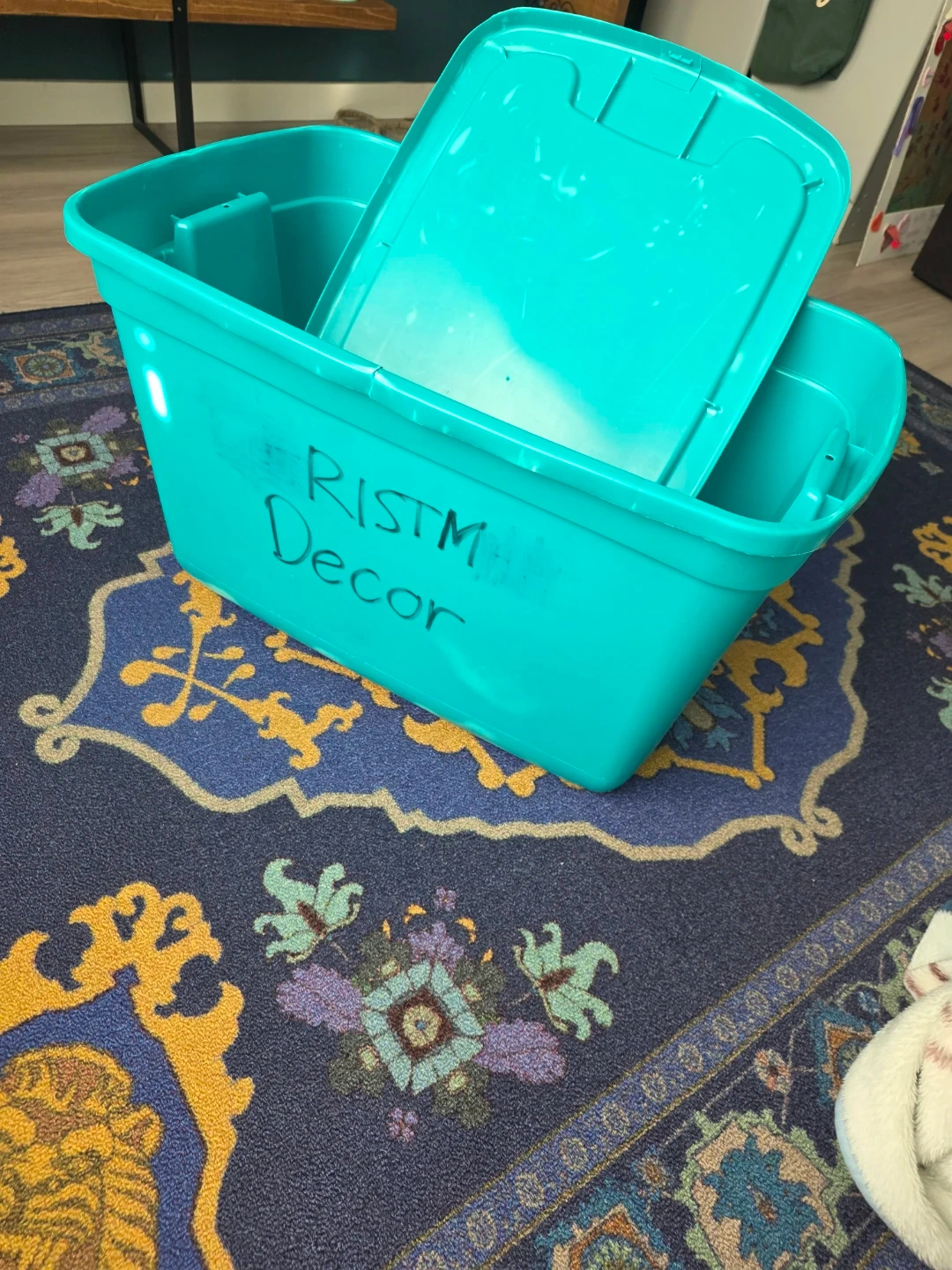 Selling a turquoise storage bin with a lid. It's in good condition and ready to help you organize your space - there is a small crack but in working condition.