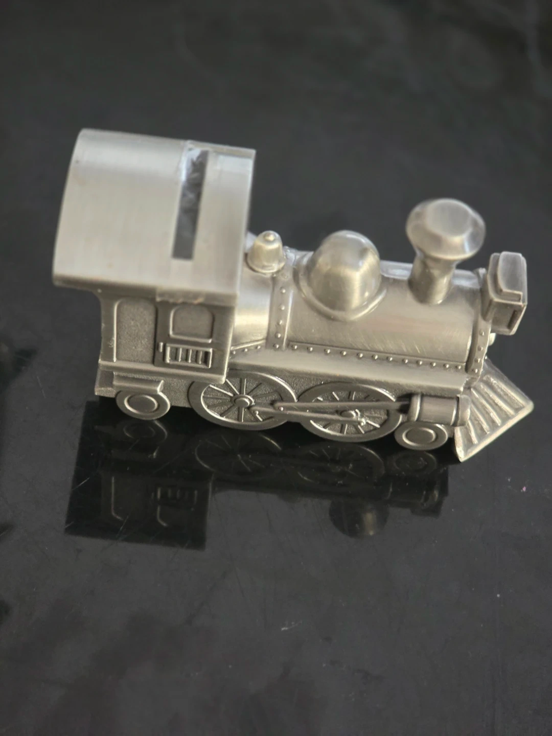 The item is a train-shaped money bank, often referred to as a "train piggy bank" or "locomotive still bank".