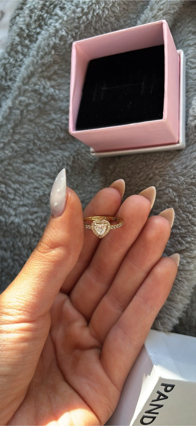 A lovely Pandora ring with a heart-shaped stone, surrounded by smaller stones. It's made of gold-toned metal. Comes with its original Pandora box!