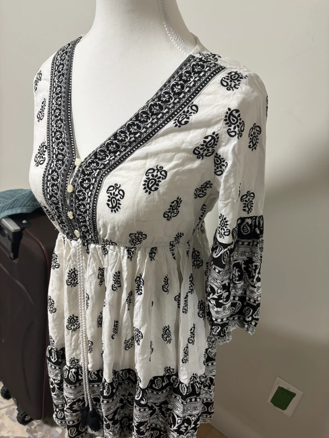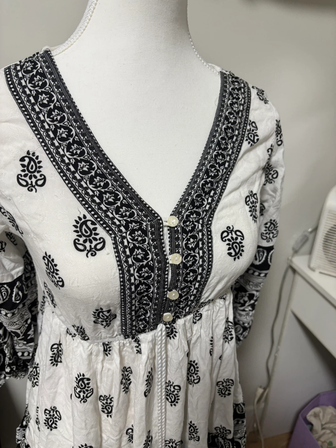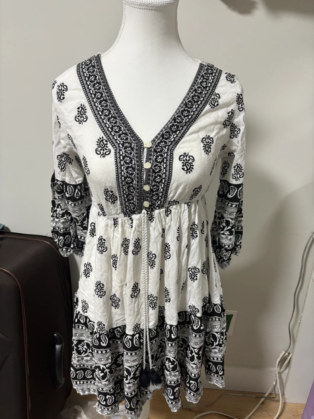Here's a cute dress with a white base and a striking black pattern! It features a V-neck with button details and a drawstring waist for a flattering fit. The 3/4 sleeves add a touch of elegance