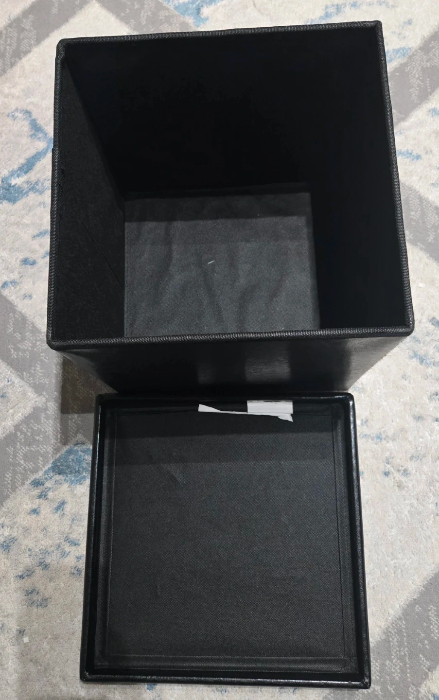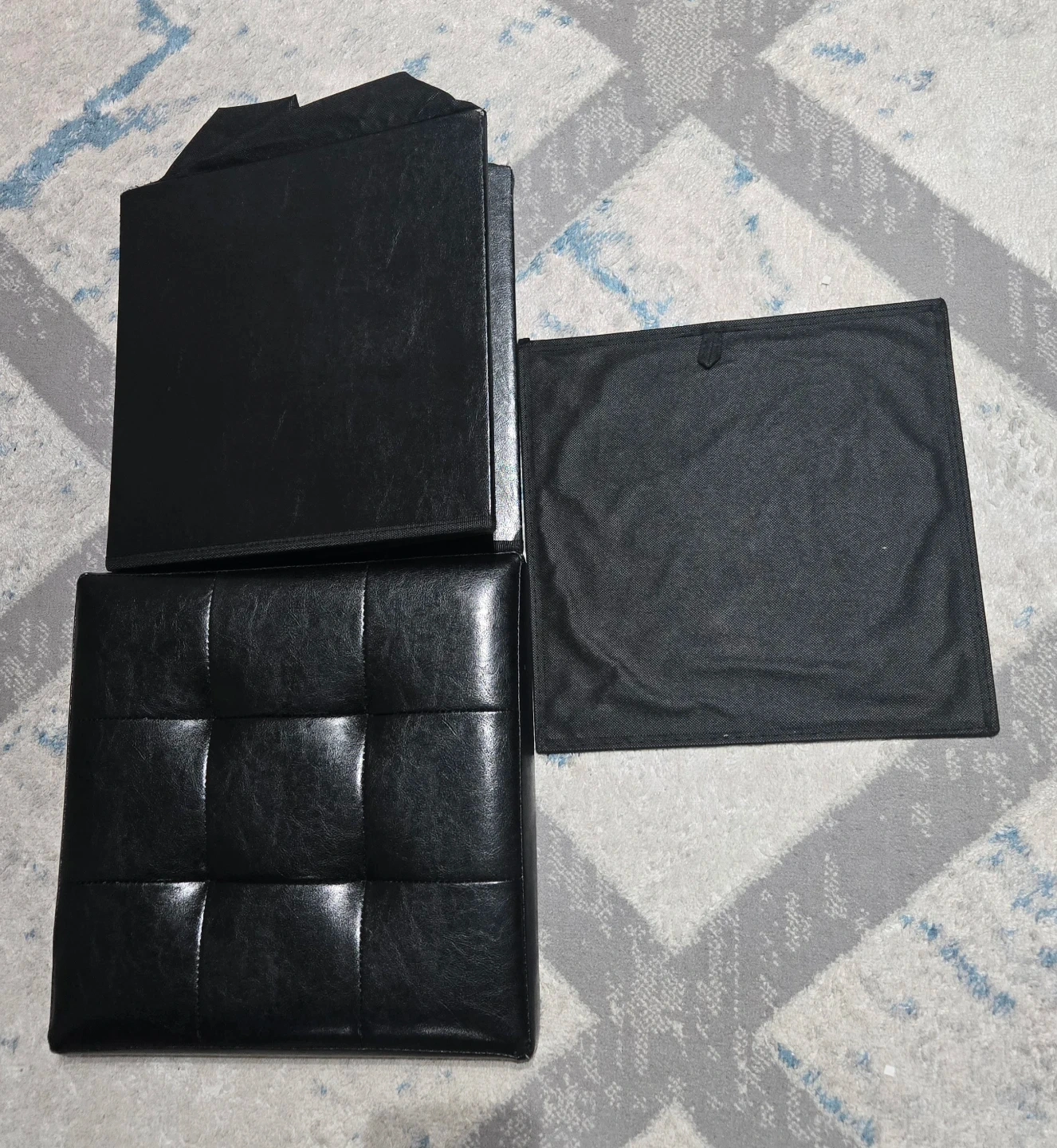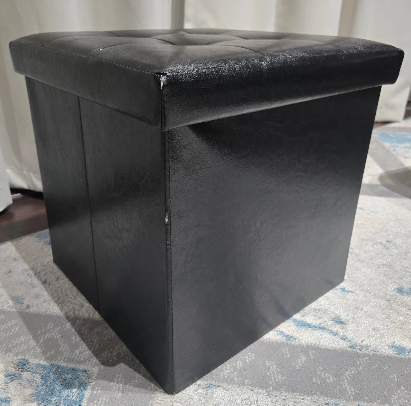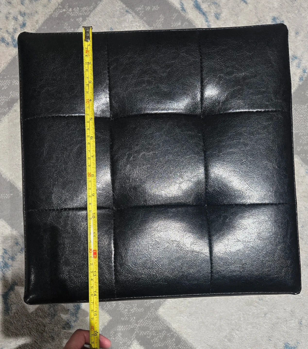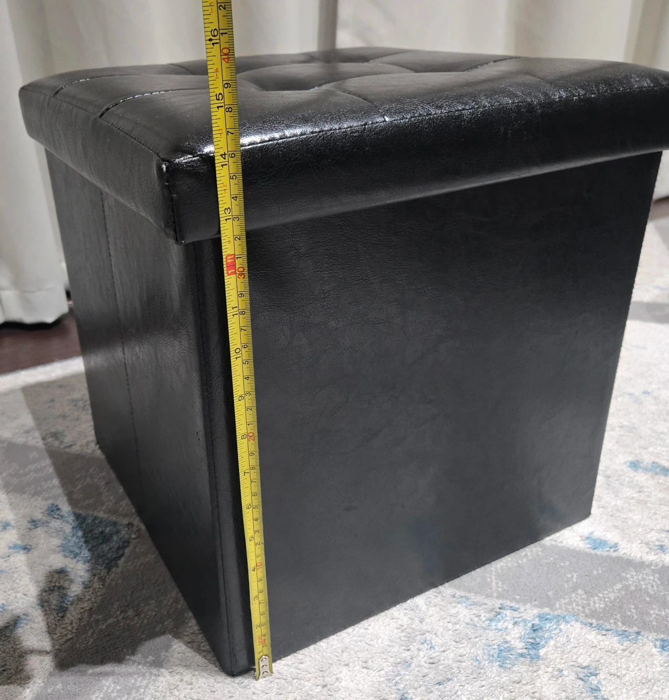 This is a black faux leather storage ottoman. It measures approximately 15x15 inches. It's in good condition. Pick up Signal Hill. Cash only