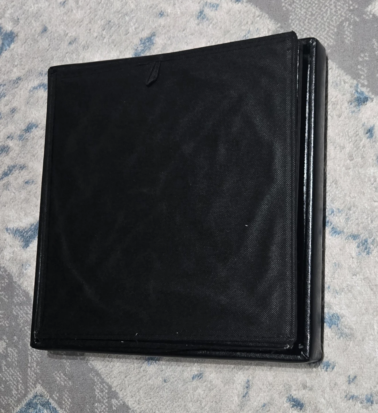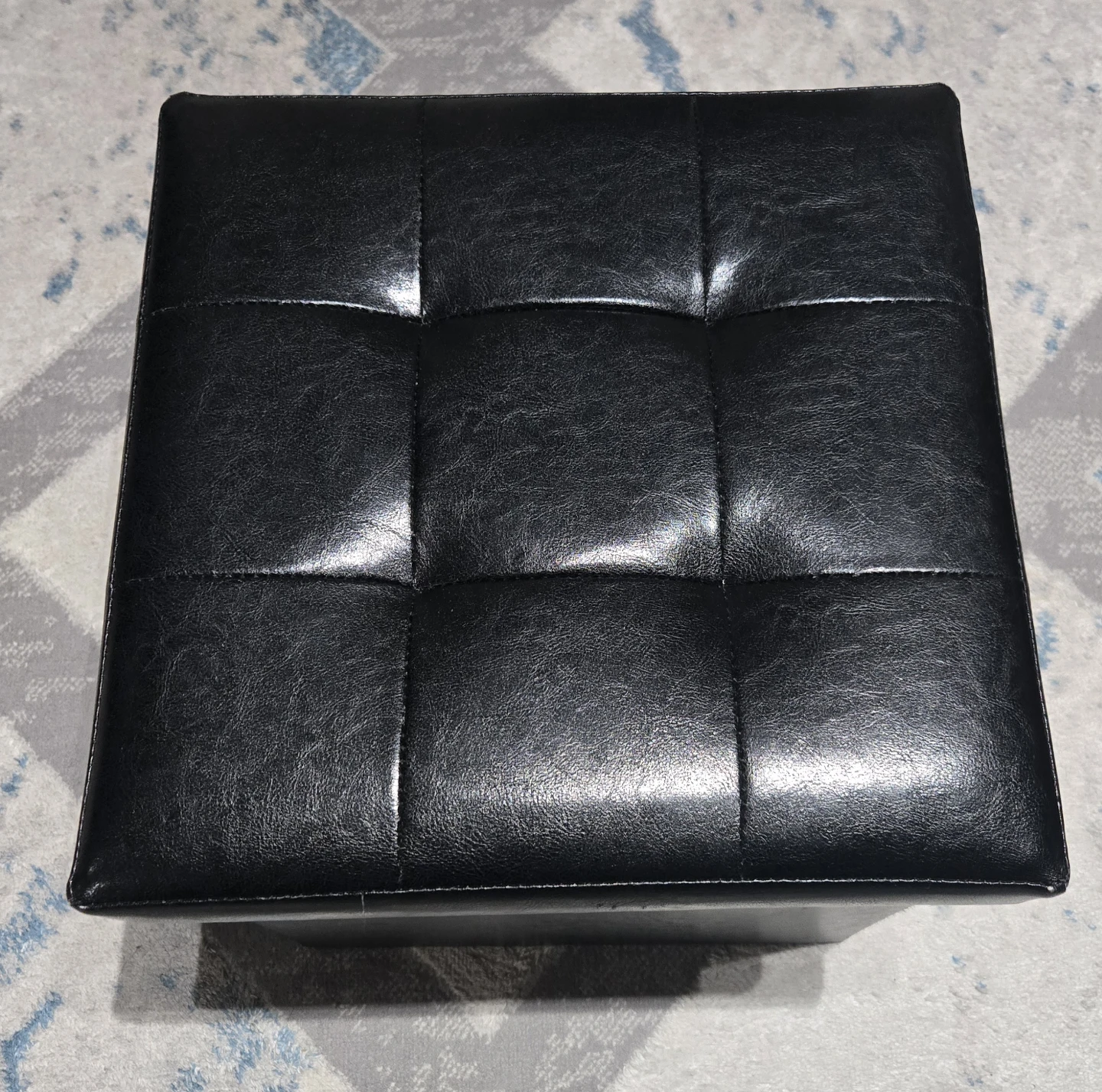 This is a black faux leather storage ottoman. It measures approximately 15x15 inches. It's in good condition. Pick up Signal Hill. Cash only