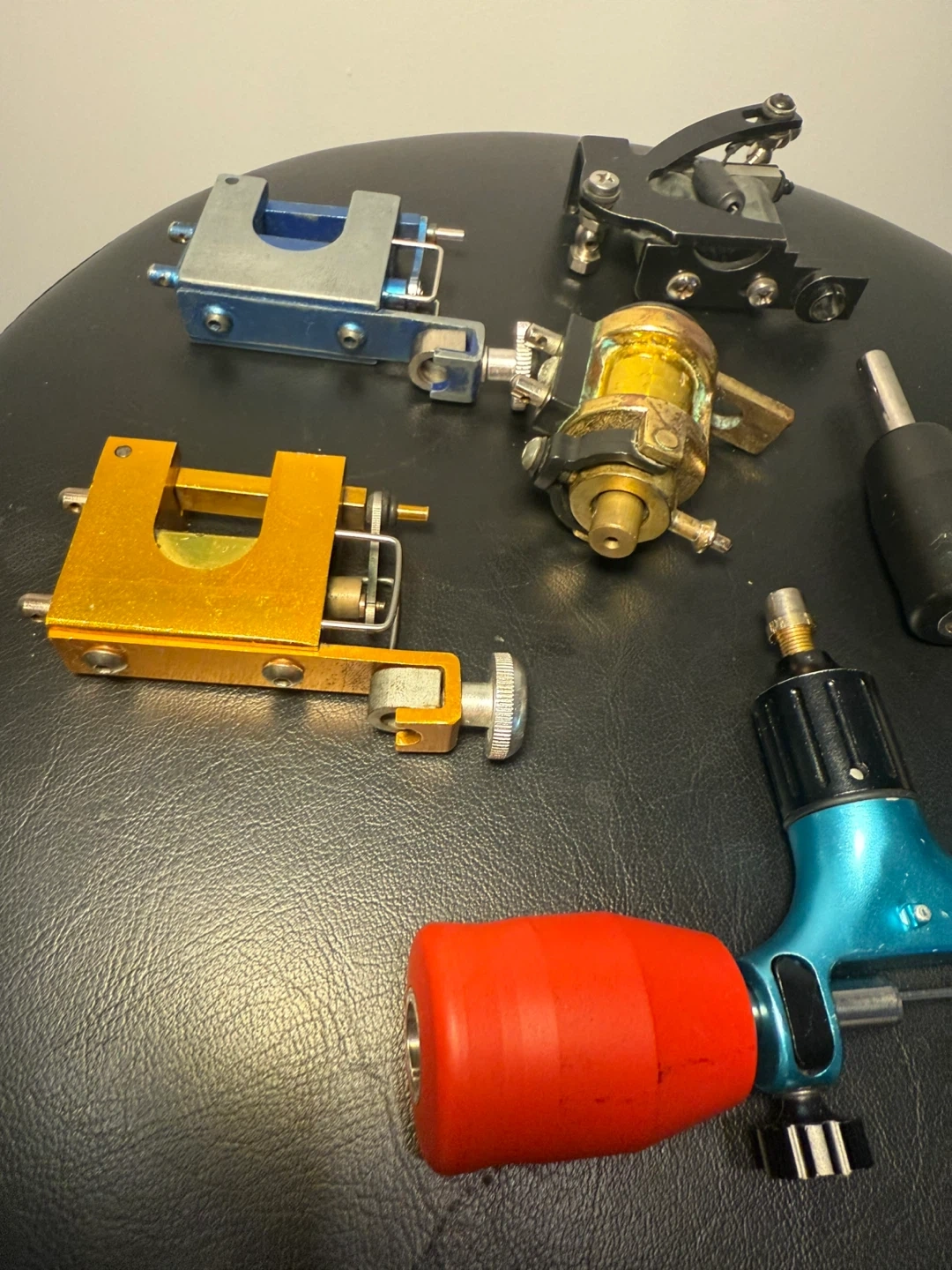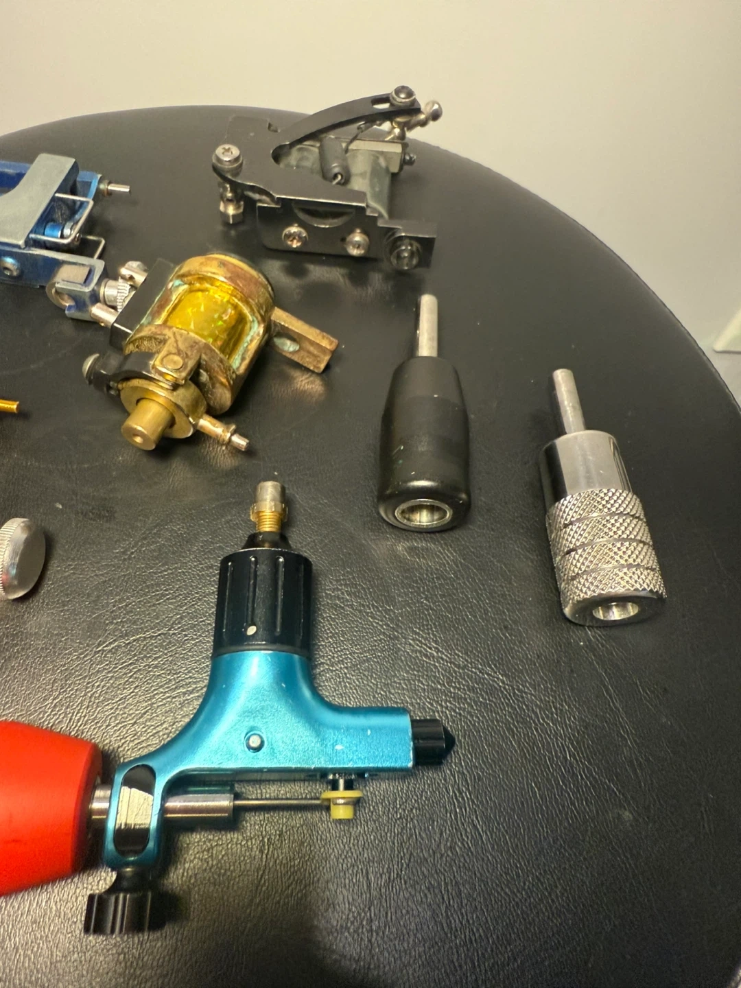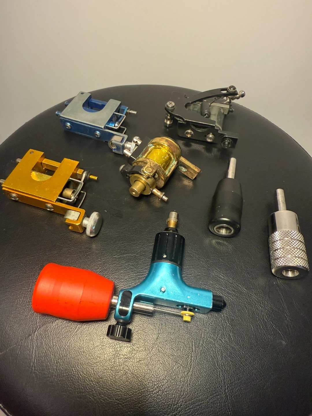 This is a lot of tattoo machines and grips. Includes a blue rotary machine with a red grip, a gold rotary machine, a black coil machine, and a brass rotary machine. Also includes two different metal grips and one black rubber grip. Various tattoo equipment.