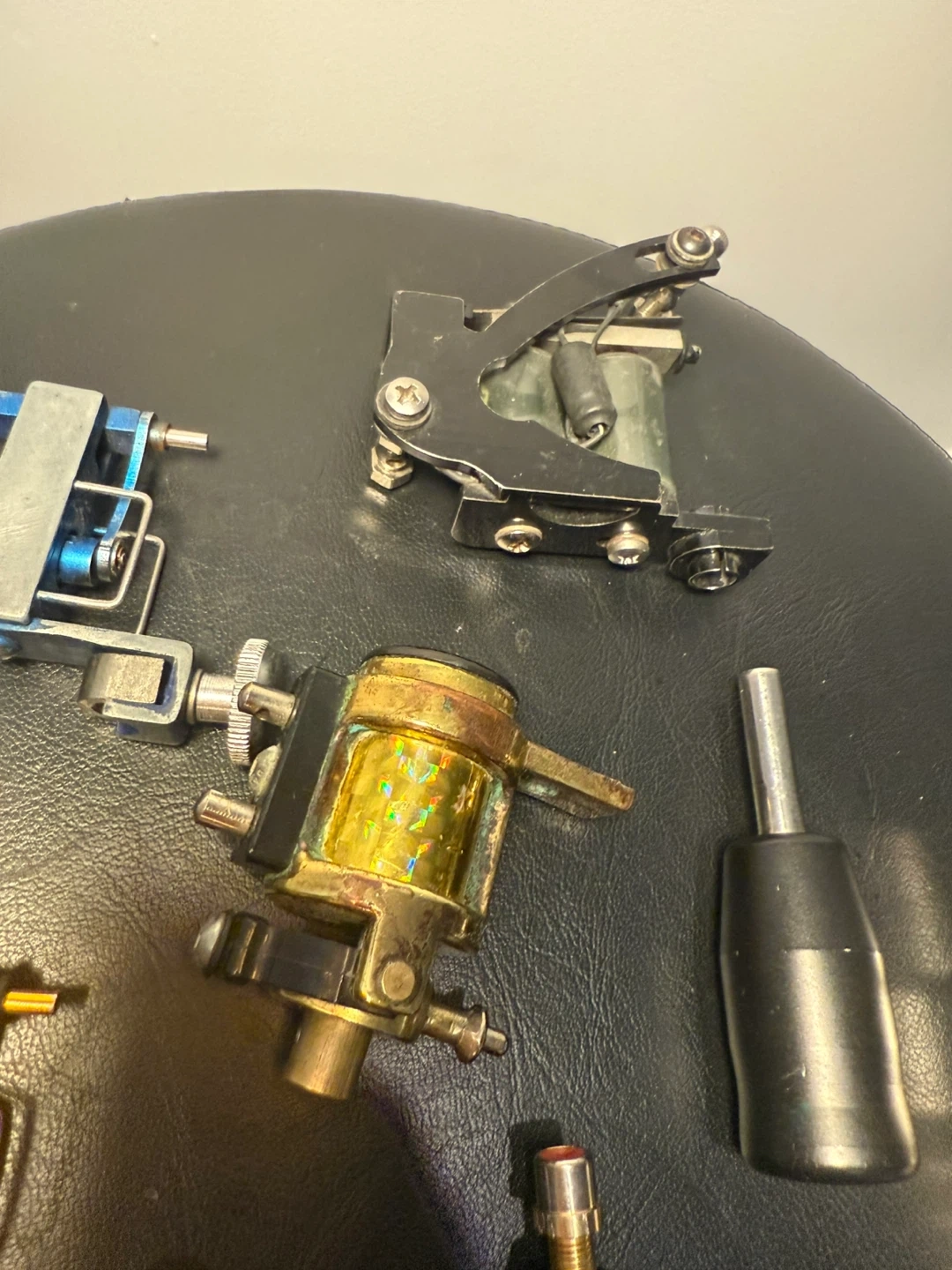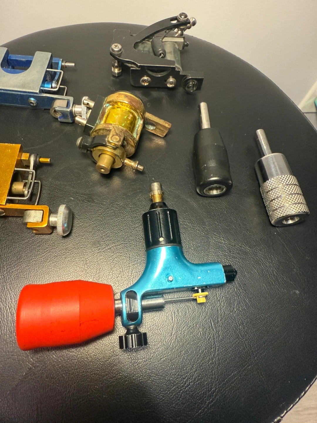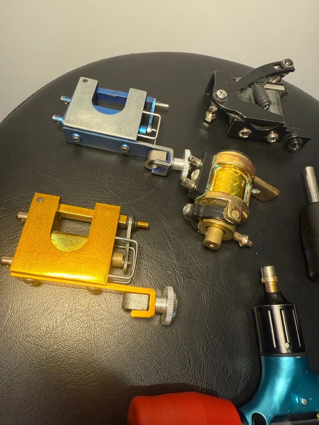 This is a lot of tattoo machines and grips. Includes a blue rotary machine with a red grip, a gold rotary machine, a black coil machine, and a brass rotary machine. Also includes two different metal grips and one black rubber grip. Various tattoo equipment.