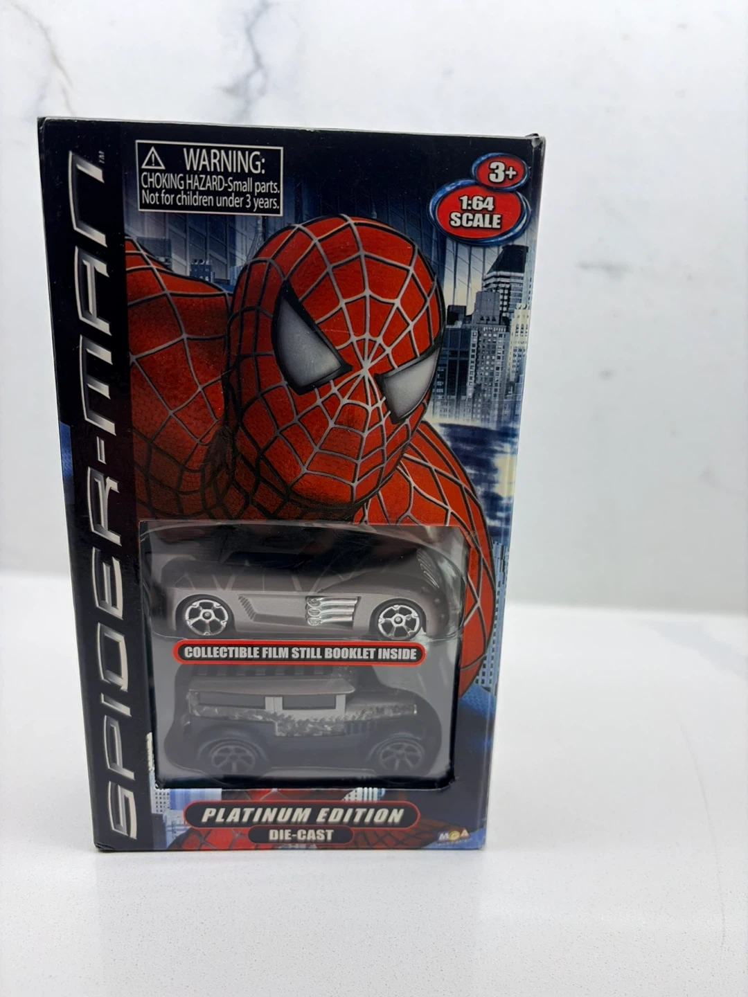 This is a Spider-Man Platinum Edition die-cast vehicle in 1:64 scale. It comes with a collectible film still booklet inside. This would be a fun addition for any Spider-Man fan or collector!