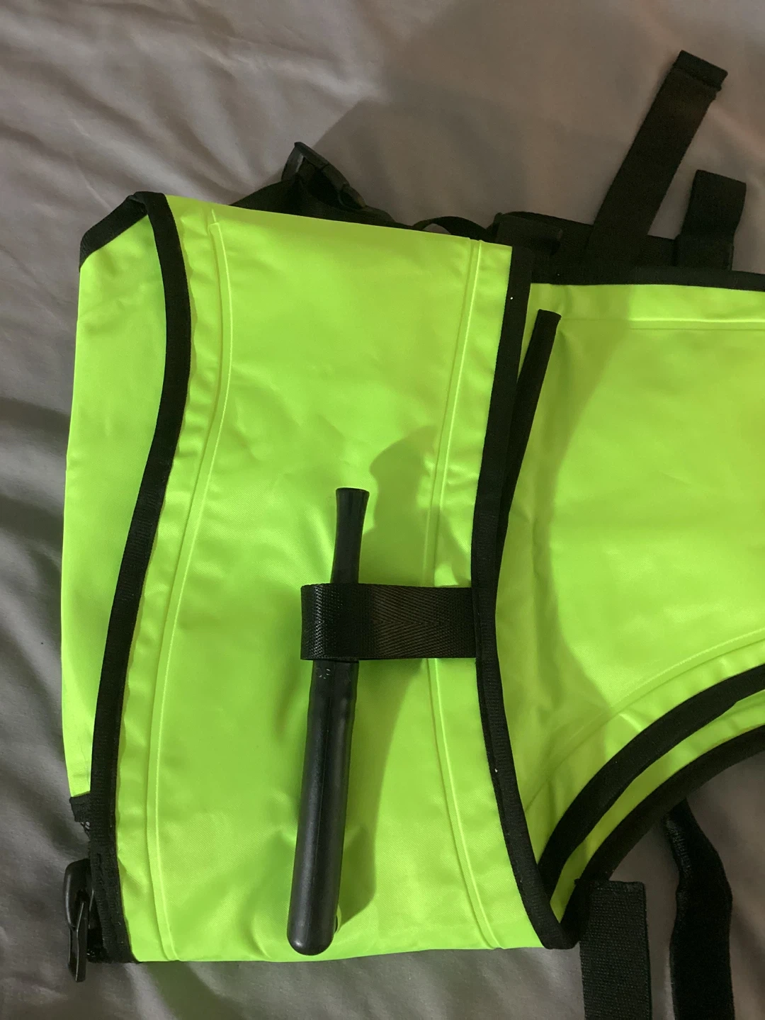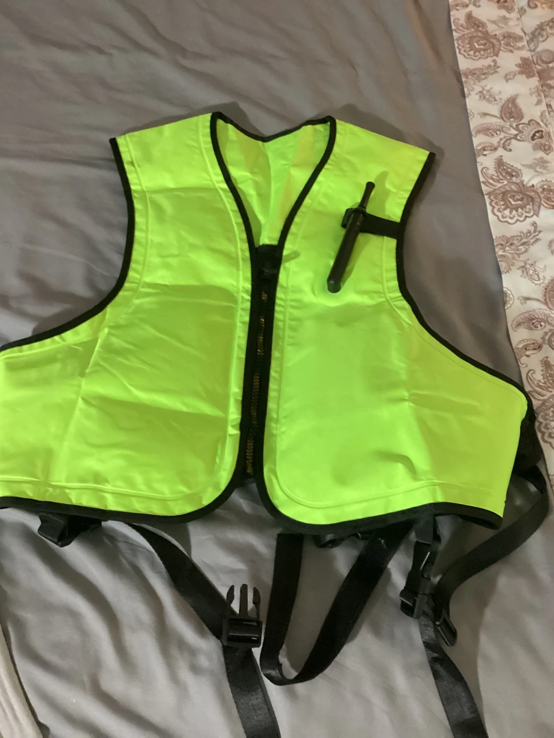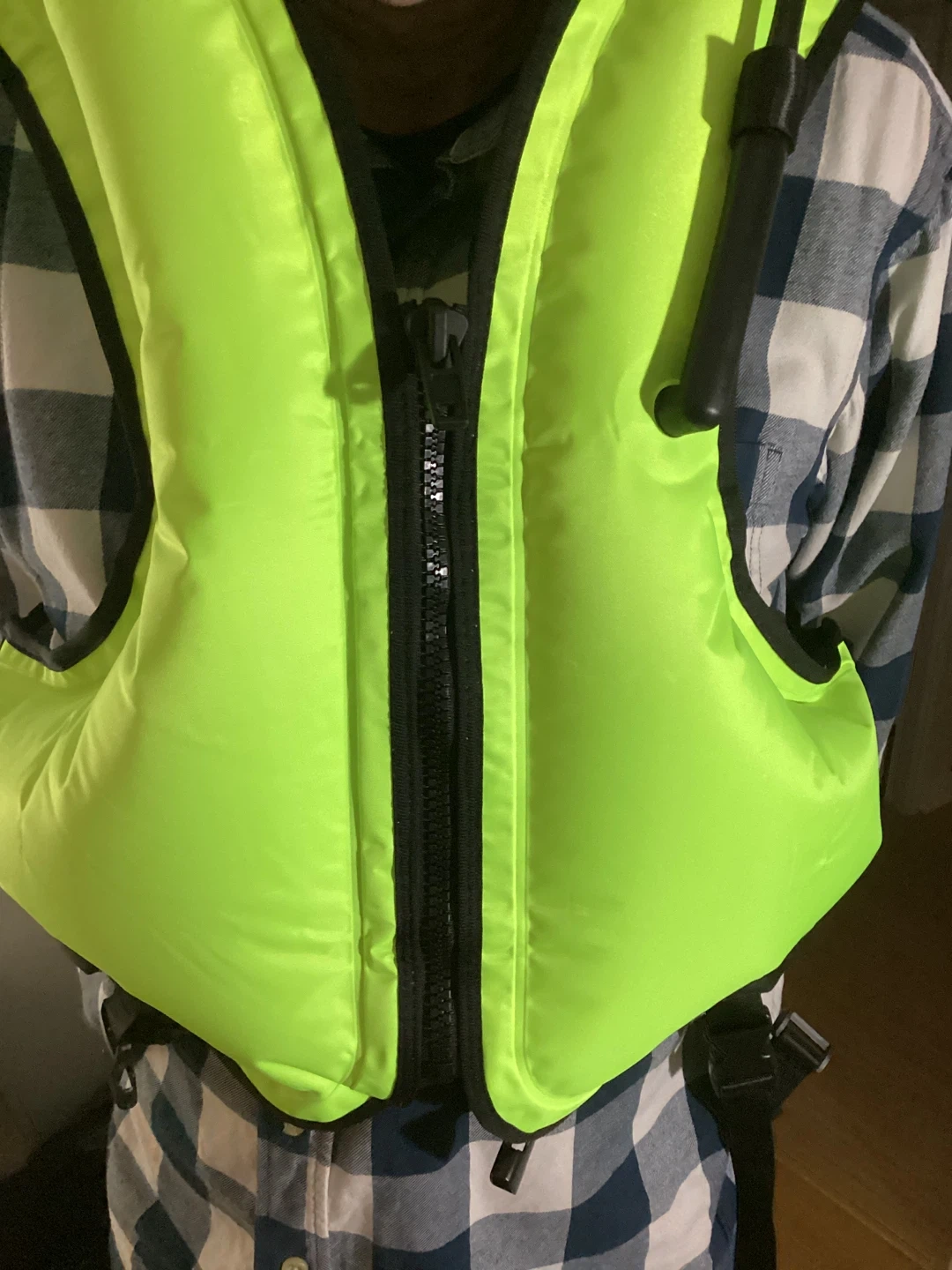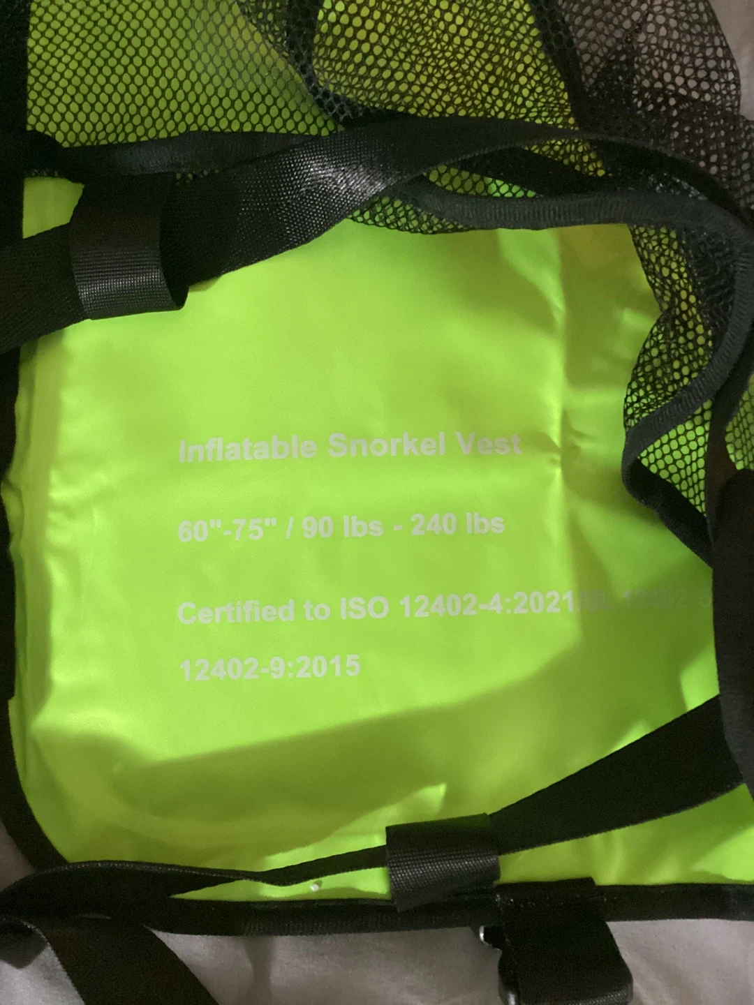 This is a unisex Jurmickey inflatable snorkel vest, perfect for adults and teens! It's highlighter green and adjustable, fitting weights from 90 lbs to 240 lbs. It's made of polyvinyl chloride (PVC) and is lightweight, durable and portable for easy travel.