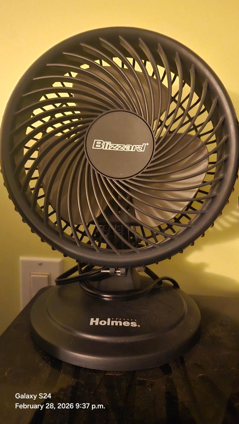This is a black Blizzard Holmes personal fan. It's a compact desk turning fan with multiple speed settings. Useful for personal cooling in small spaces.