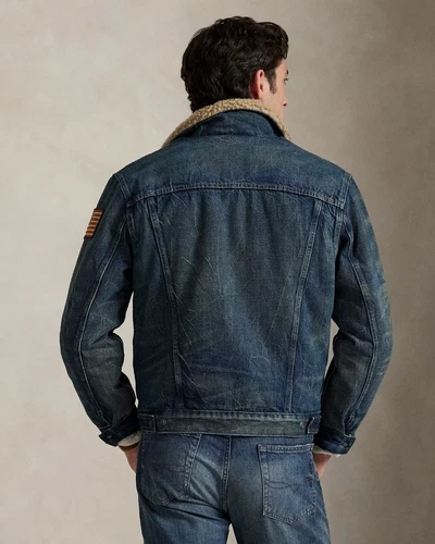 This is a version of the iconic denim trucker jacket, featuring a soft fleece lining and an American flag patch. It has a fleece straight collar, a snapped placket with custom "Polo Ralph Lauren" logo snaps, and long sleeves with snapped barrel cuffs. There's an American flag patch on the left sleeve. The jacket includes two chest snapped pockets, two front waist welt pockets, and a "Polo" label on the left chest pocket. It also has adjustable buttoned tabs at the back waist. The jacket is fully lined, with the body lined in fleece. Shell: 100% cotton. Sleeve lining: 100% cupro. Body and collar lining: 67% polyester, 33%.