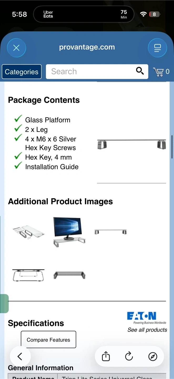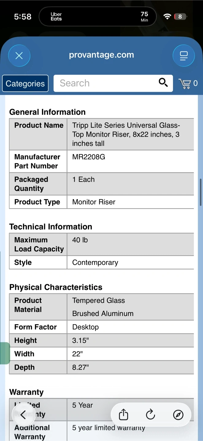 Tempered glass monitor riser with brushed aluminum legs. Provides extra space for keyboard storage underneath. Supports up to 40 lbs.