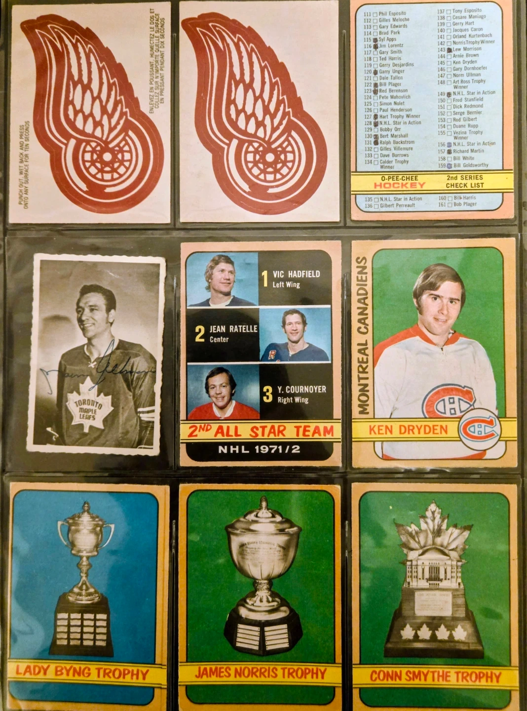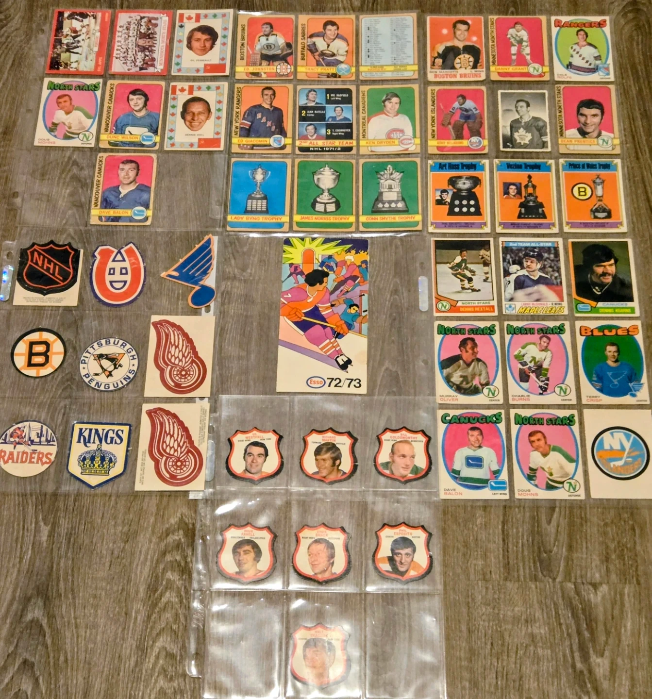 Collection of vintage 1970's O-Pee-Chee hockey cards including 2 Rare 72/73 Red Wings Logo Inserts, fully intact not punched EX-NRMT, 72/73 Ken Dryden 2nd Year Card EX, Rare 70/71 Norm Ullman Decal Edge EX, 74/75 Trophy Winners-Bernie Parent, Phil Esposito and Bruins Prince of Wales All VG or Better, 72/73 Trophy Cards G-EX, Terry Crisp RC, Don Marcotte RC, Syl Apps, Rare NYI Team Logo EX-NRMT, 1972/73 Imperial Esso NHL Hockey Schedule, 1972/73 Checklist 2nd Series, 1972/73 Rare High Number 250 NHL All Stars Hatfield, Ratelle and Cournoyer, 72 Summit Series Cards, Perrault and Dennis Hull, 7 Team Logos 1972 Inserts, Punched including Rare WHA RAIDERS Logo, 7 Player Crest Logos, Punched plus many more 70's Vintage Cards.