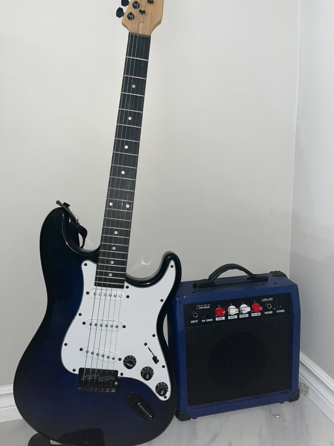 This is a LUX electric guitar and a blue amplifier. It's a great starter package for anyone looking to learn guitar. Perfect for jamming at home! The only issue is the connector cable from the amp to the guitar is spotty so I will include it but you can also get a new one off amazon for $10-16 :)