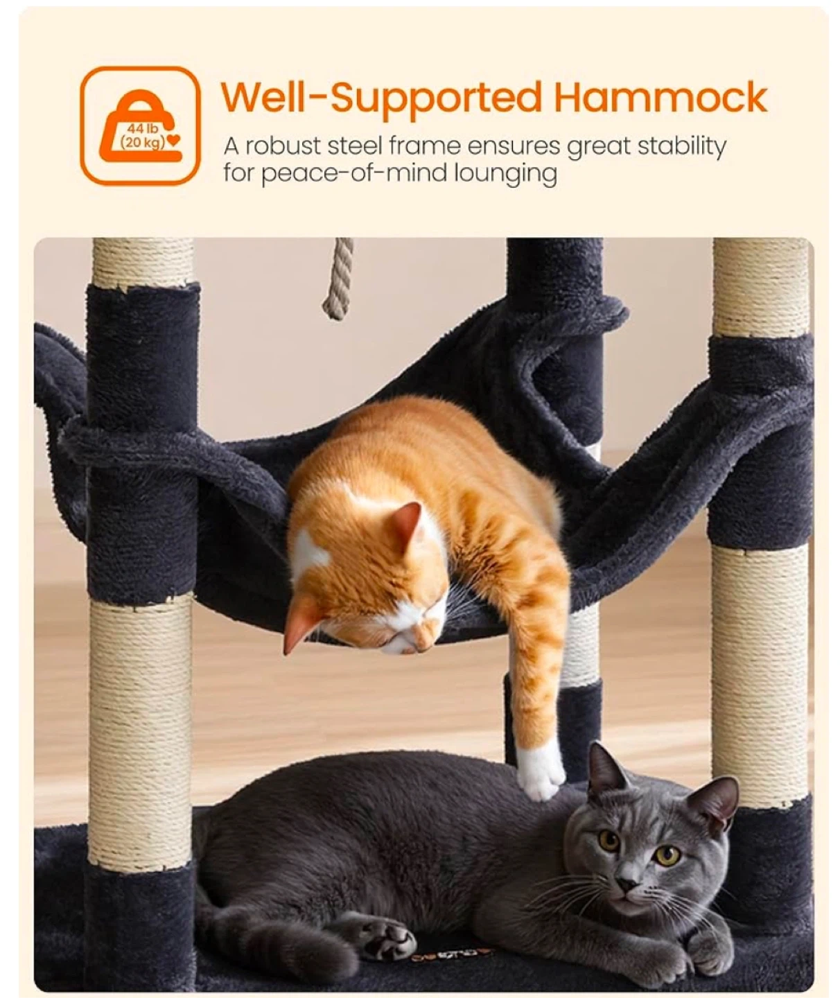 This cat tree features multiple levels for climbing and lounging, including a cozy hideaway box and a comfortable hammock. It's made with durable sisal rope for scratching posts and plush fabric surfaces. The hammock supports up to 44 lbs (20 kg).