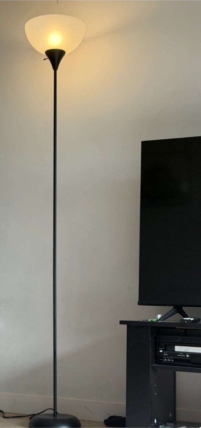 Tall black torchiere floor lamp with a frosted glass shade. It provides ambient up-lighting for any room. The lamp has a sturdy base and a slim profile.