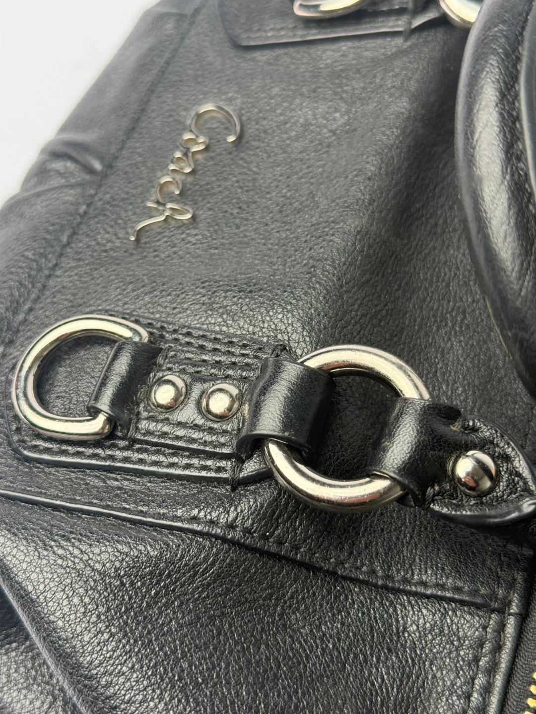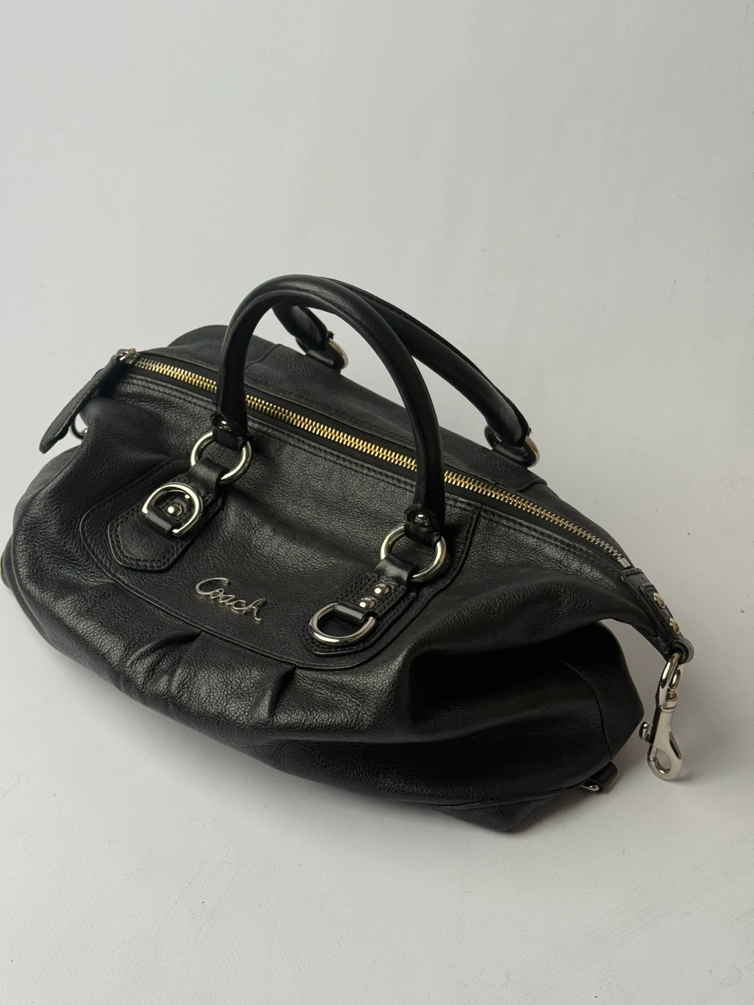 This is a Coach bag crafted from full-grain cowhide leather. It features silver-tone hardware and a vibrant purple satin lining. Interior has a zip pocket and two slip pockets.