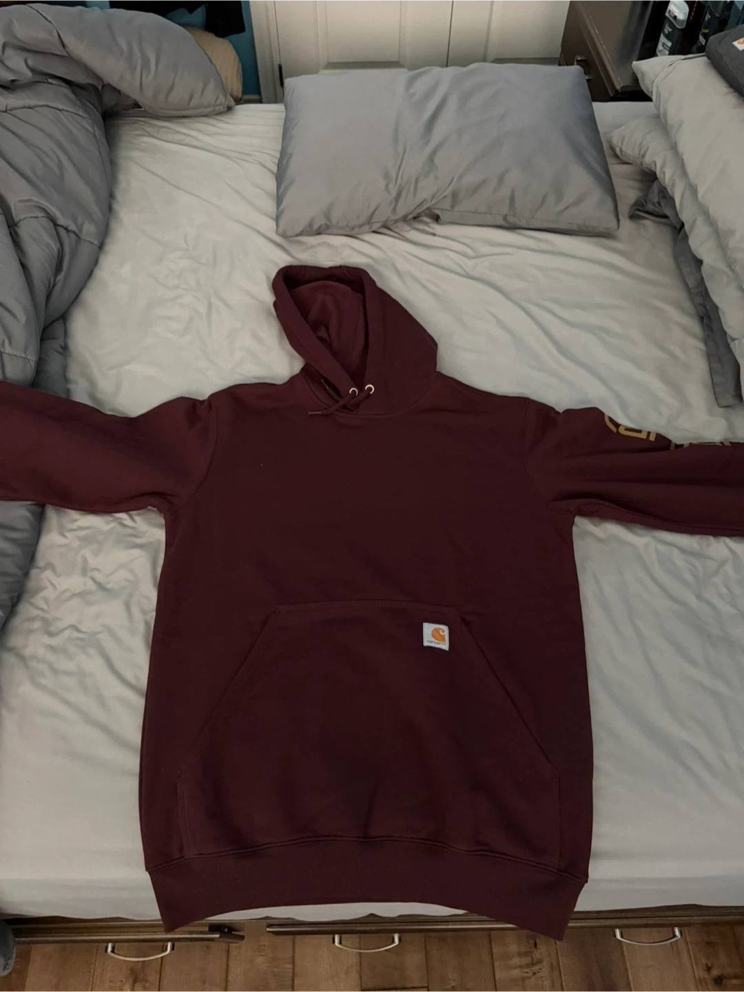 This is a Carhartt hoodie in a loose fit, size small. It's made in Vietnam. Classic Carhartt durability for everyday wear!