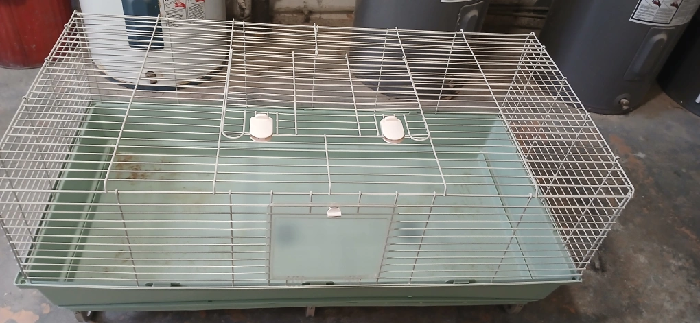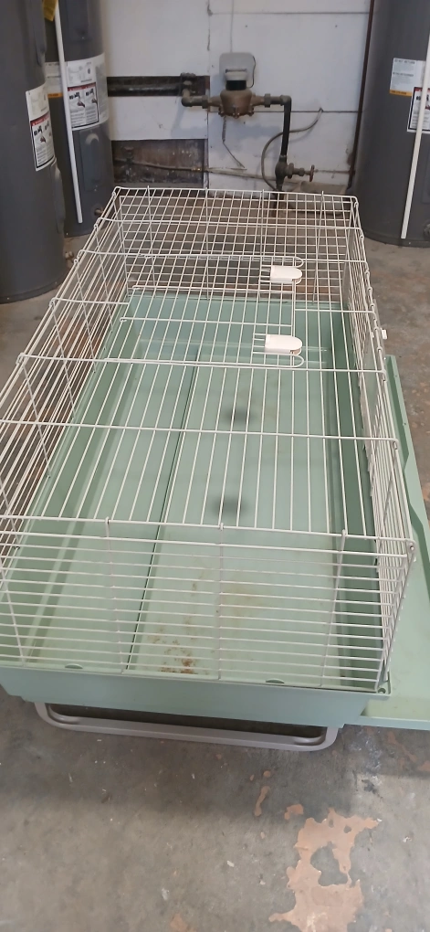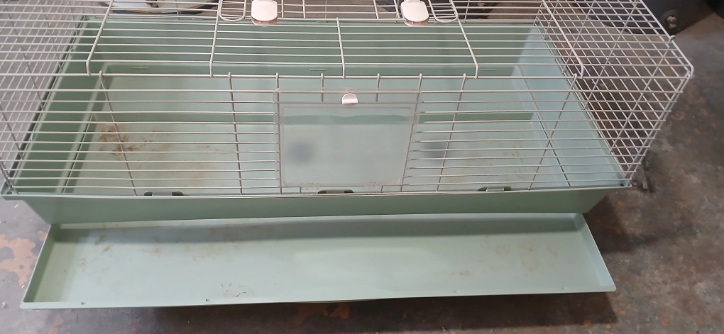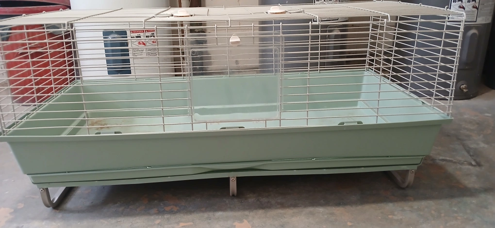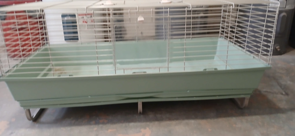 Spacious pet cage, features a pull-out tray for easy cleaning. Metal wire construction. Green plastic base and tray. Includes a small door.