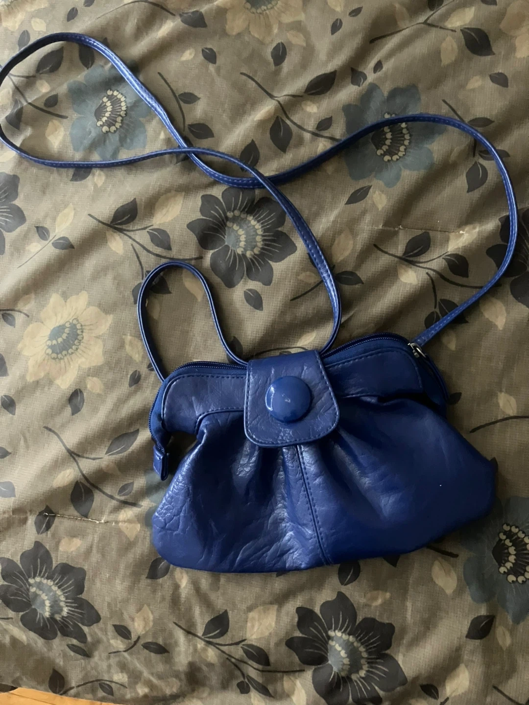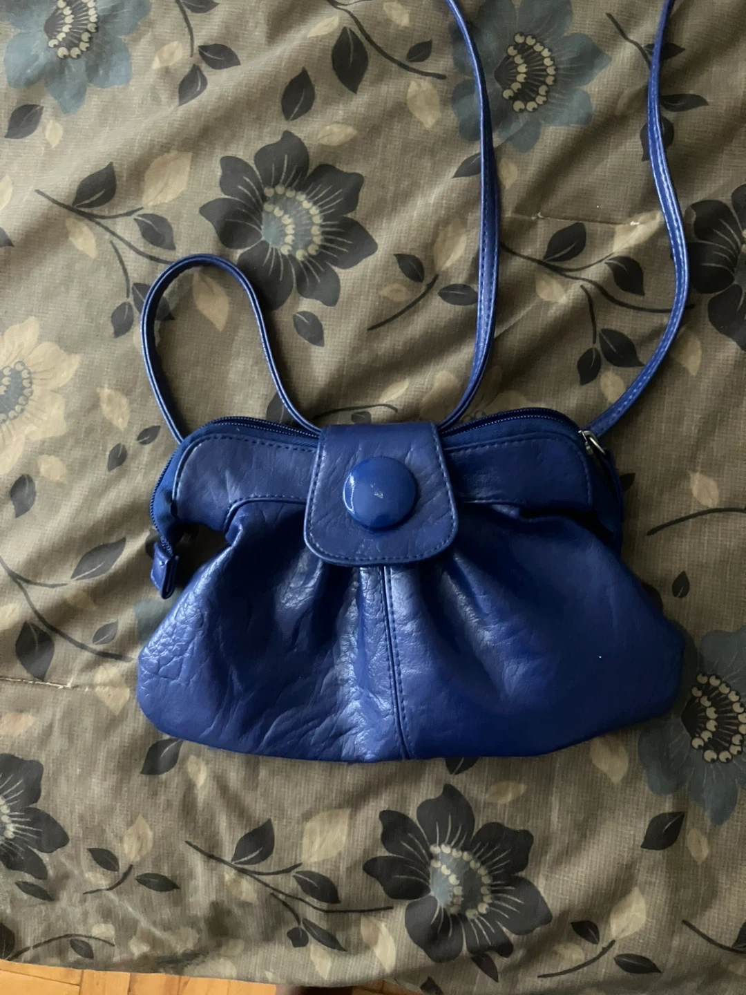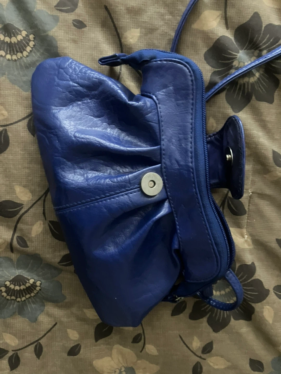 A chic blue clutch purse with a faux leather finish. It has a main zippered compartment and a decorative button snap closure. The interior is lined and includes a smaller zippered pocket.