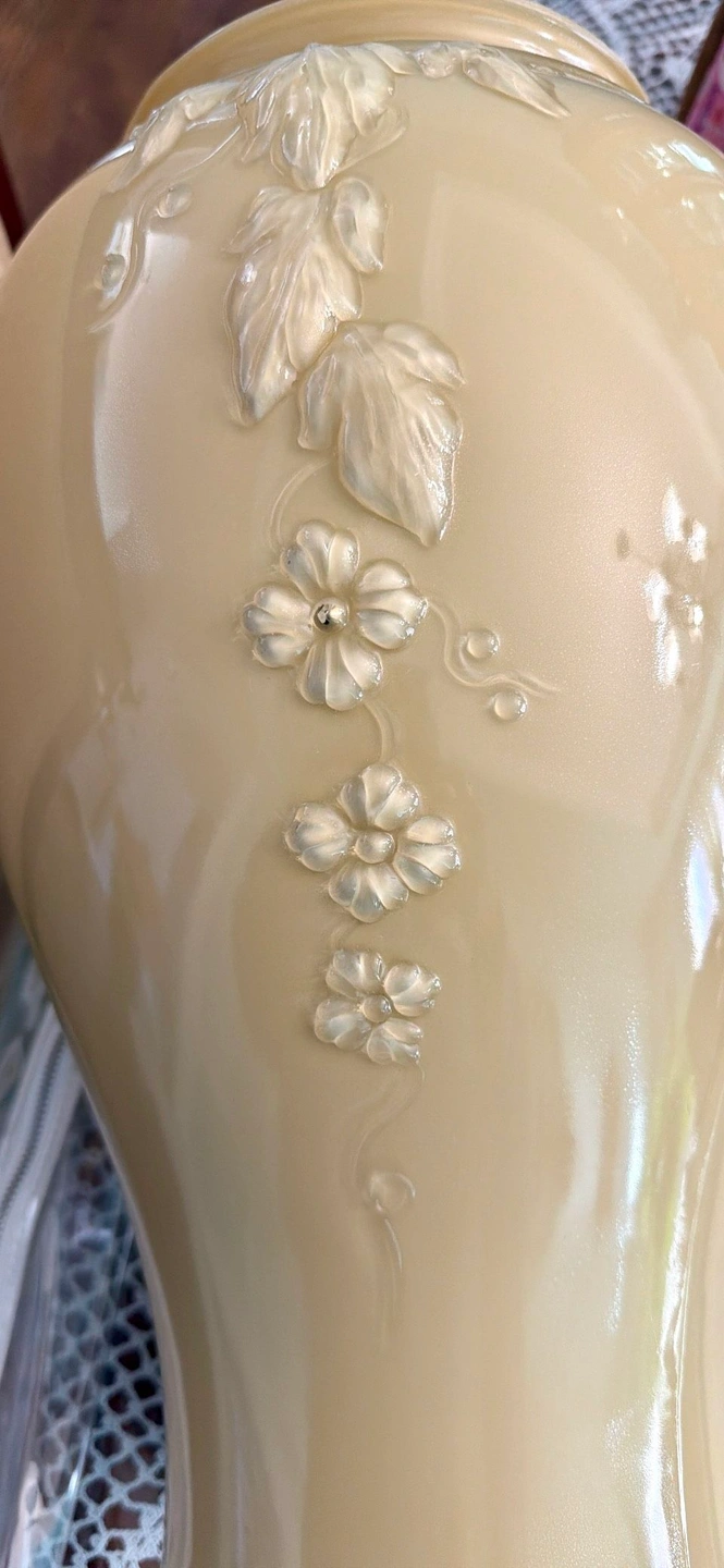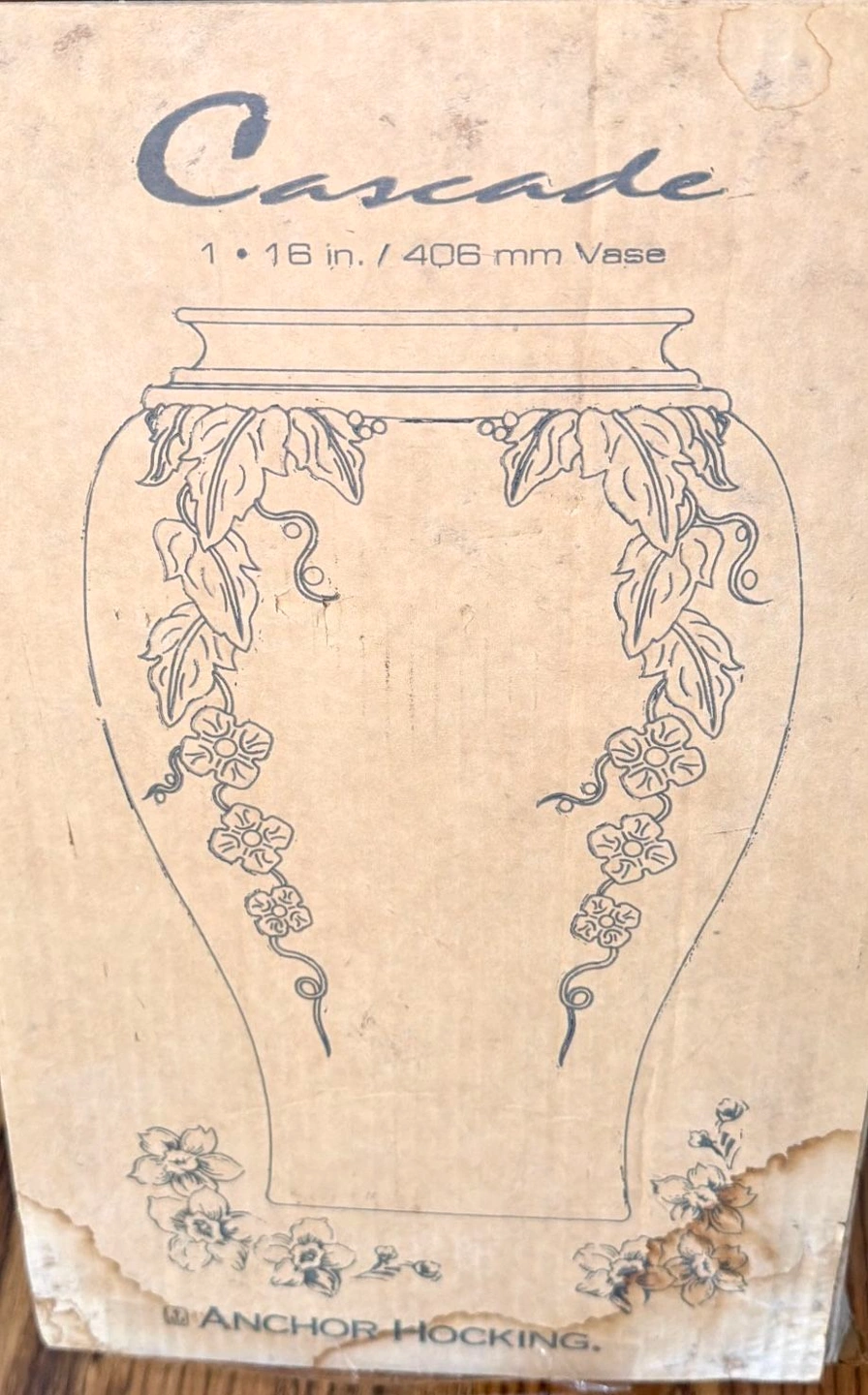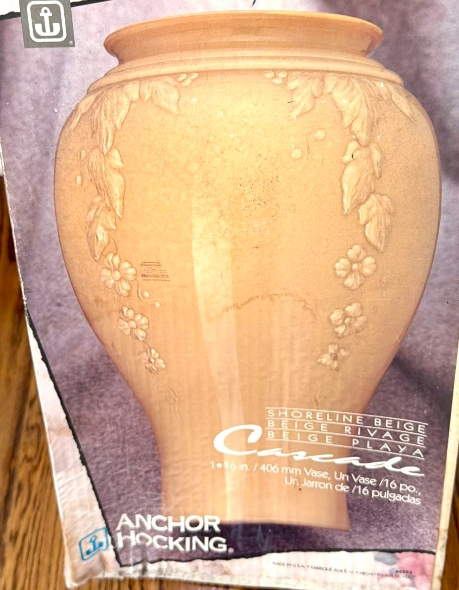 Beautiful Anchor Hocking vase in the Shoreline Beige color. This is the rare Cascade Glass design with baked enamel, from the 1980s. It features a detailed, raised glass floral pattern on all four sides, making it lovely from any angle. The vase is 16 inches tall and measures 6.5 inches across the rim, 9.5 inches at its widest, and has a 6-inch diameter base. It's a large piece, made in the USA. It's in beautiful, new condition with no chips or defects, though the original box shows wear from storage over the decades. Please note: Cash only. Buyer must pick up from the Morton Grove Area. Thank you for checking out my other listings!