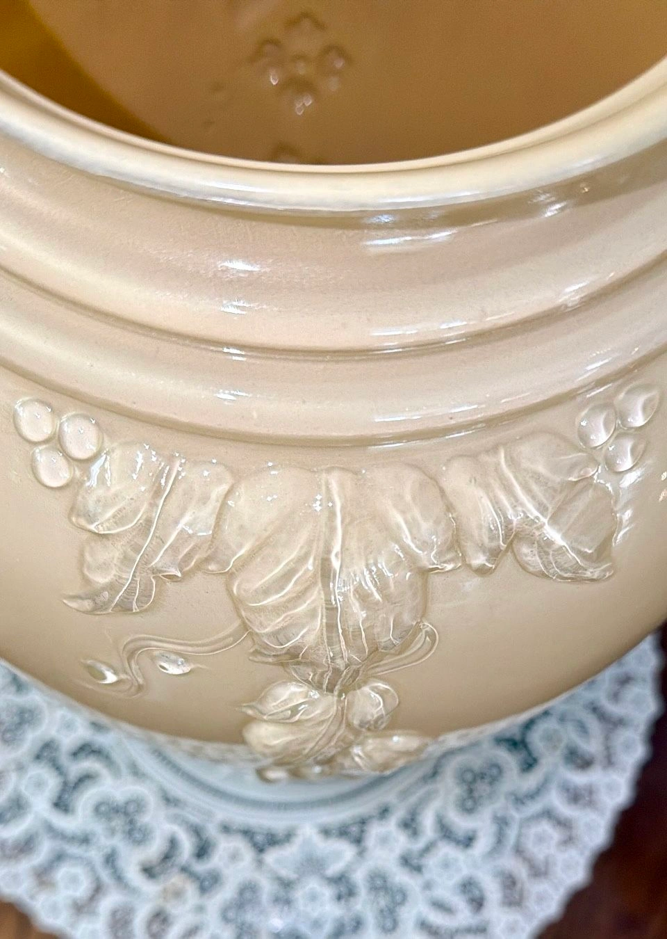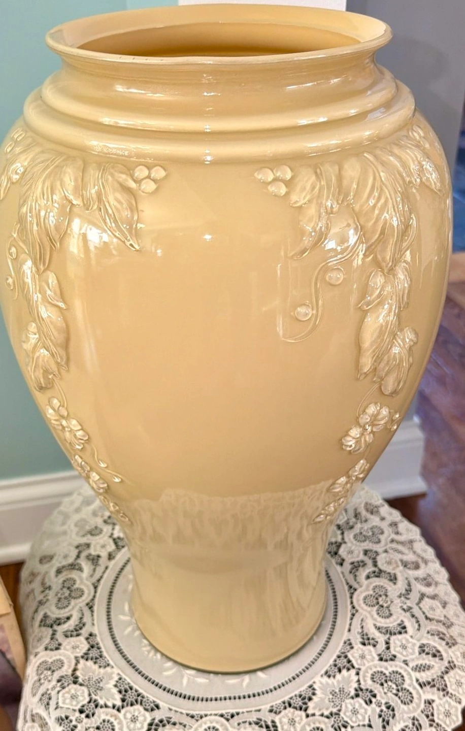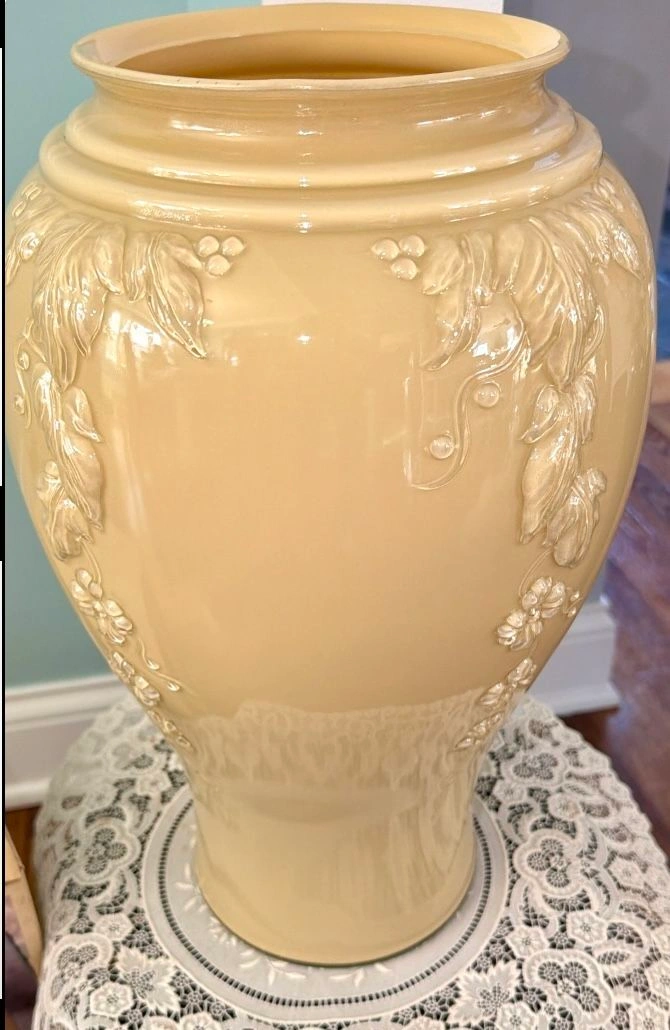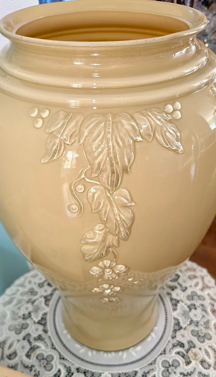 Beautiful Anchor Hocking vase in the Shoreline Beige color. This is the rare Cascade Glass design with baked enamel, from the 1980s. It features a detailed, raised glass floral pattern on all four sides, making it lovely from any angle. The vase is 16 inches tall and measures 6.5 inches across the rim, 9.5 inches at its widest, and has a 6-inch diameter base. It's a large piece, made in the USA. It's in beautiful, new condition with no chips or defects, though the original box shows wear from storage over the decades. Please note: Cash only. Buyer must pick up from the Morton Grove Area. Thank you for checking out my other listings!
