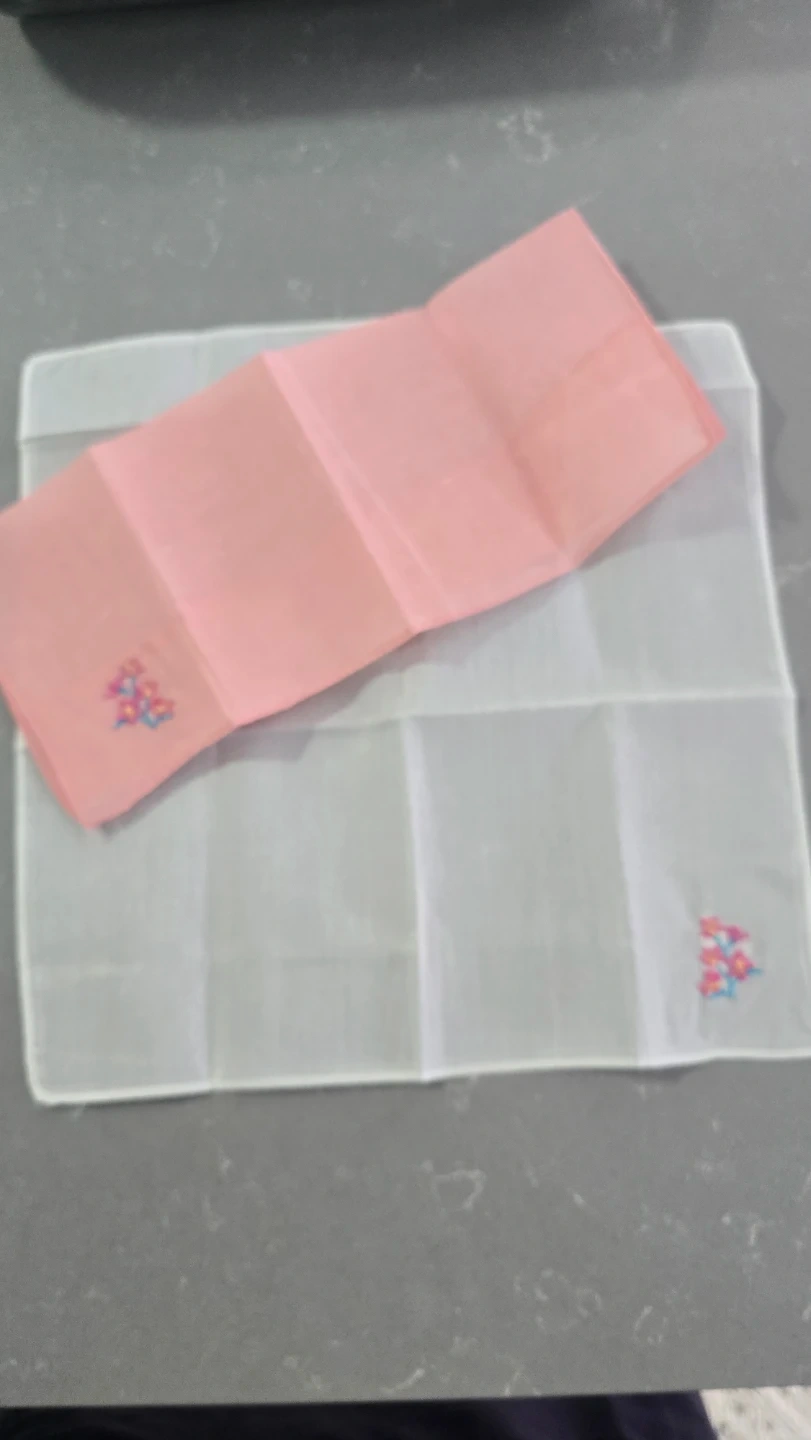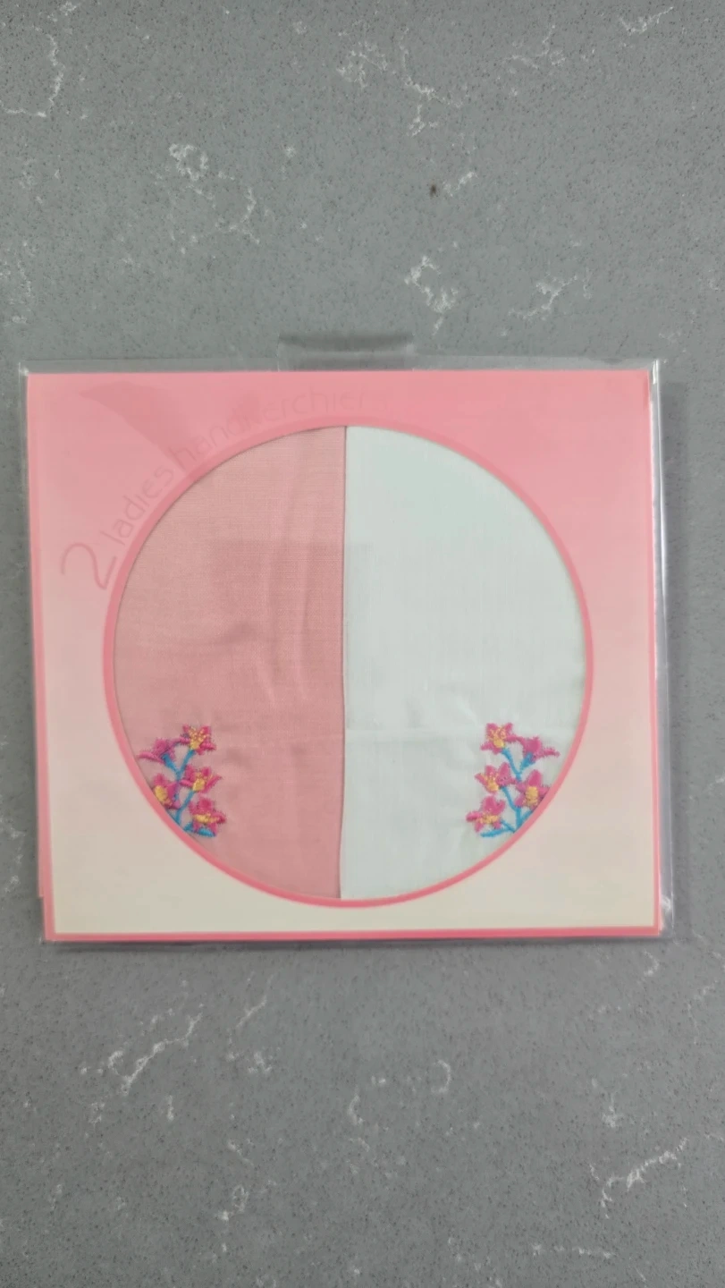 Set includes two ladies' handkerchiefs, one pink and one white. Both have delicate floral embroidery. Perfect for adding a touch of classic style to your day.Also available in bulk.