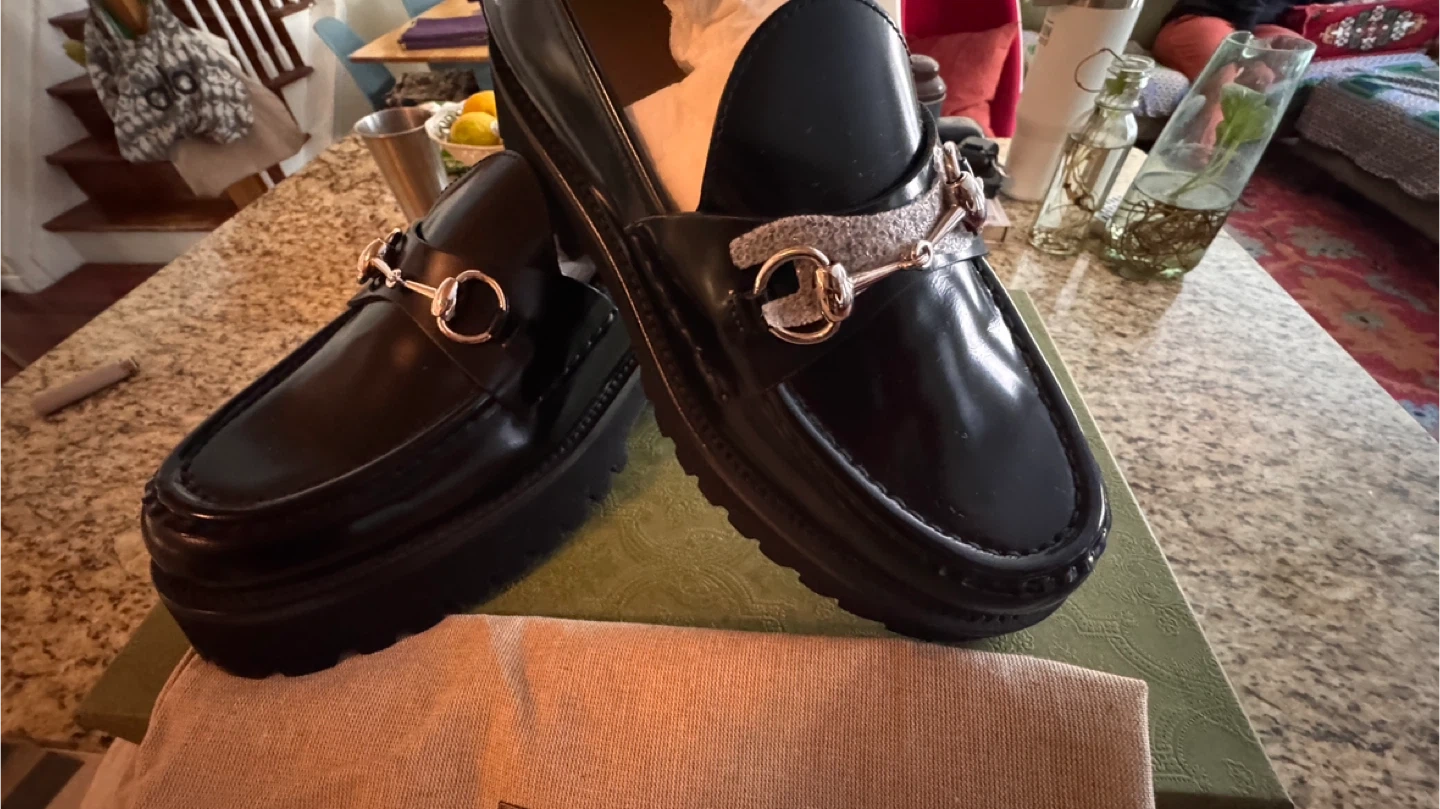 Classic Gucci black leather loafers featuring the iconic horsebit detail. These feature a chunky platform sole. Comes with original box and dust bag.