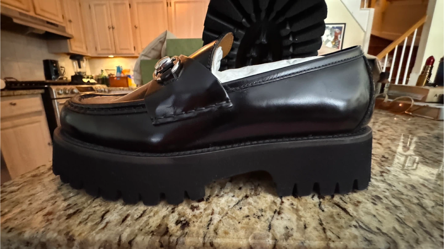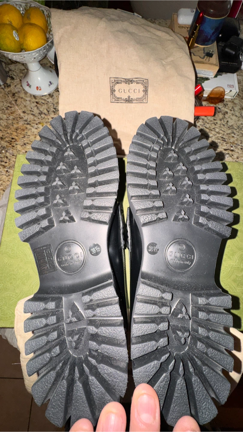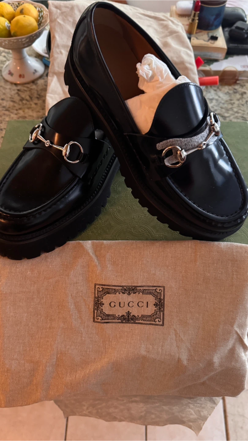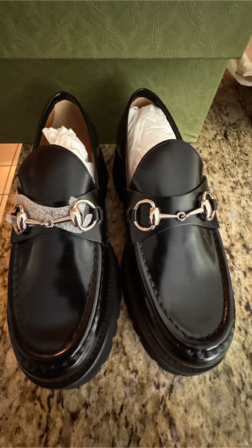 Classic Gucci black leather loafers featuring the iconic horsebit detail. These feature a chunky platform sole. Comes with original box and dust bag.