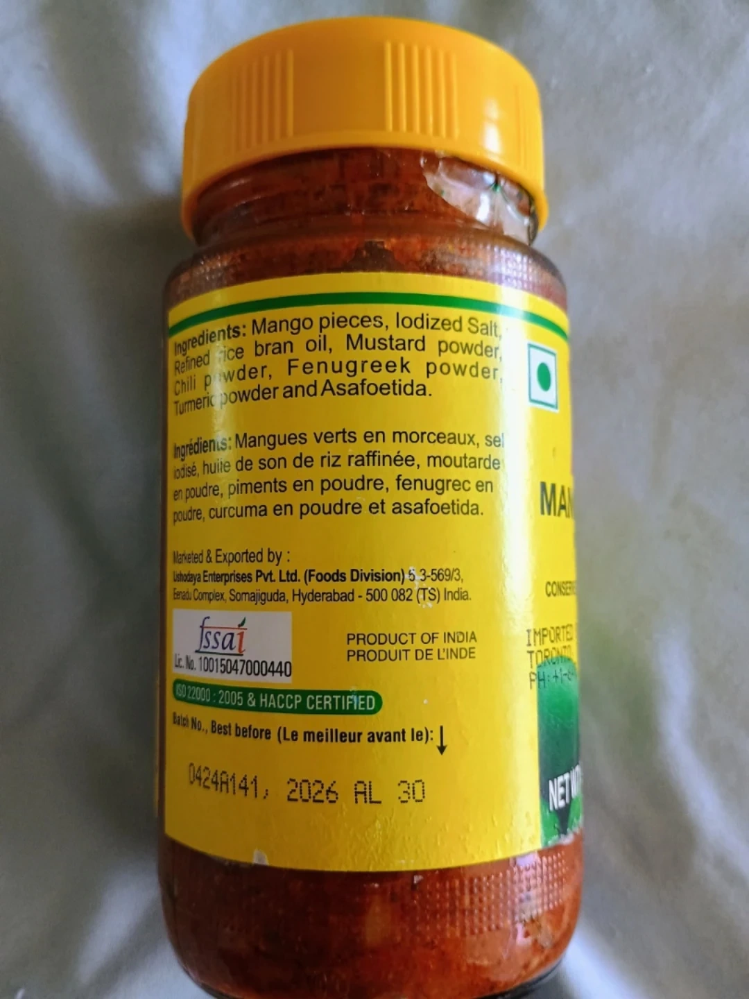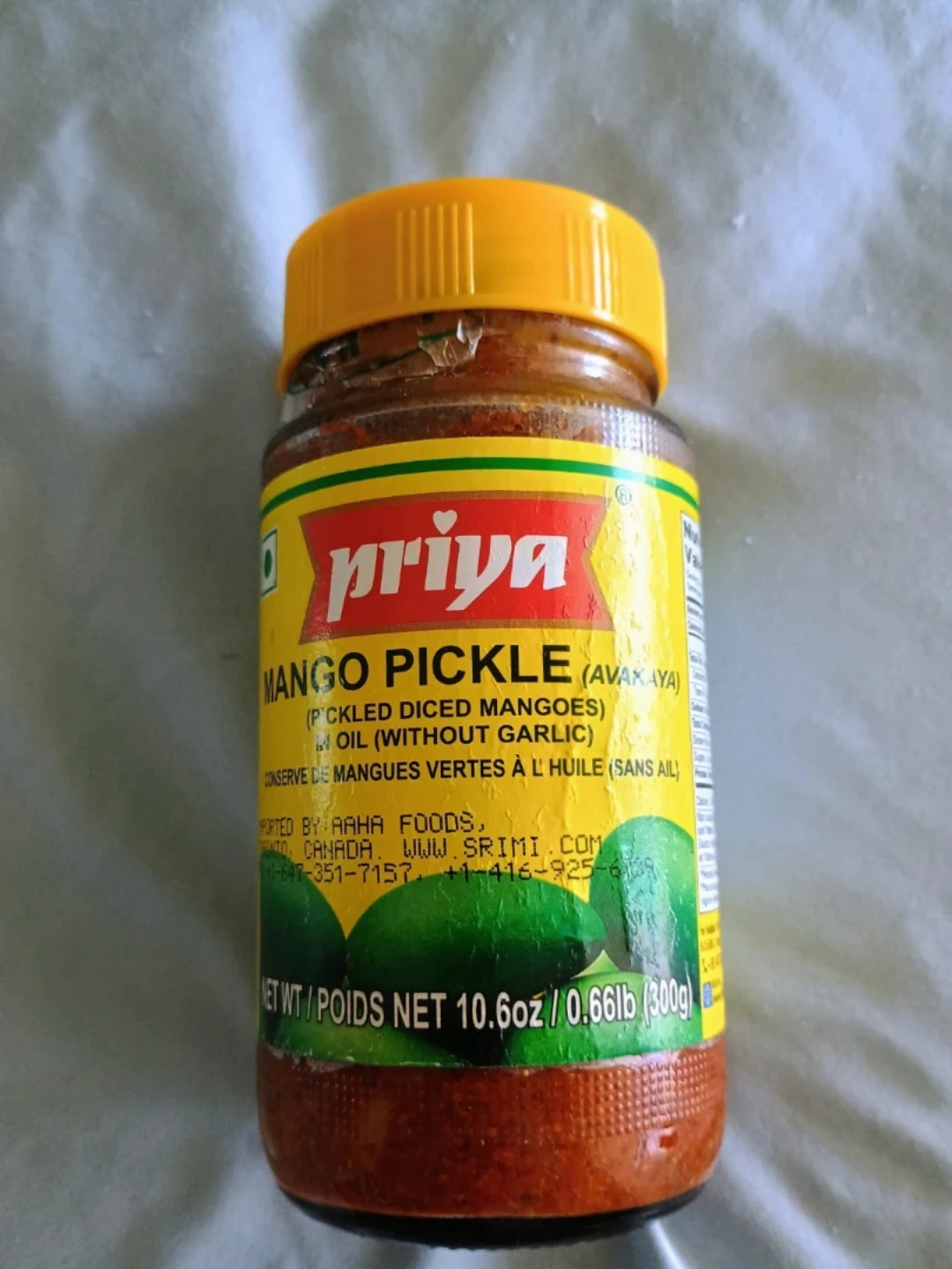 Priya brand mango pickle. It's made with pickled diced mangoes in oil. Contains rice bran oil, iodized salt, mustard, fenugreek, turmeric powder and asafoetida. Best before 2026 AL 30.