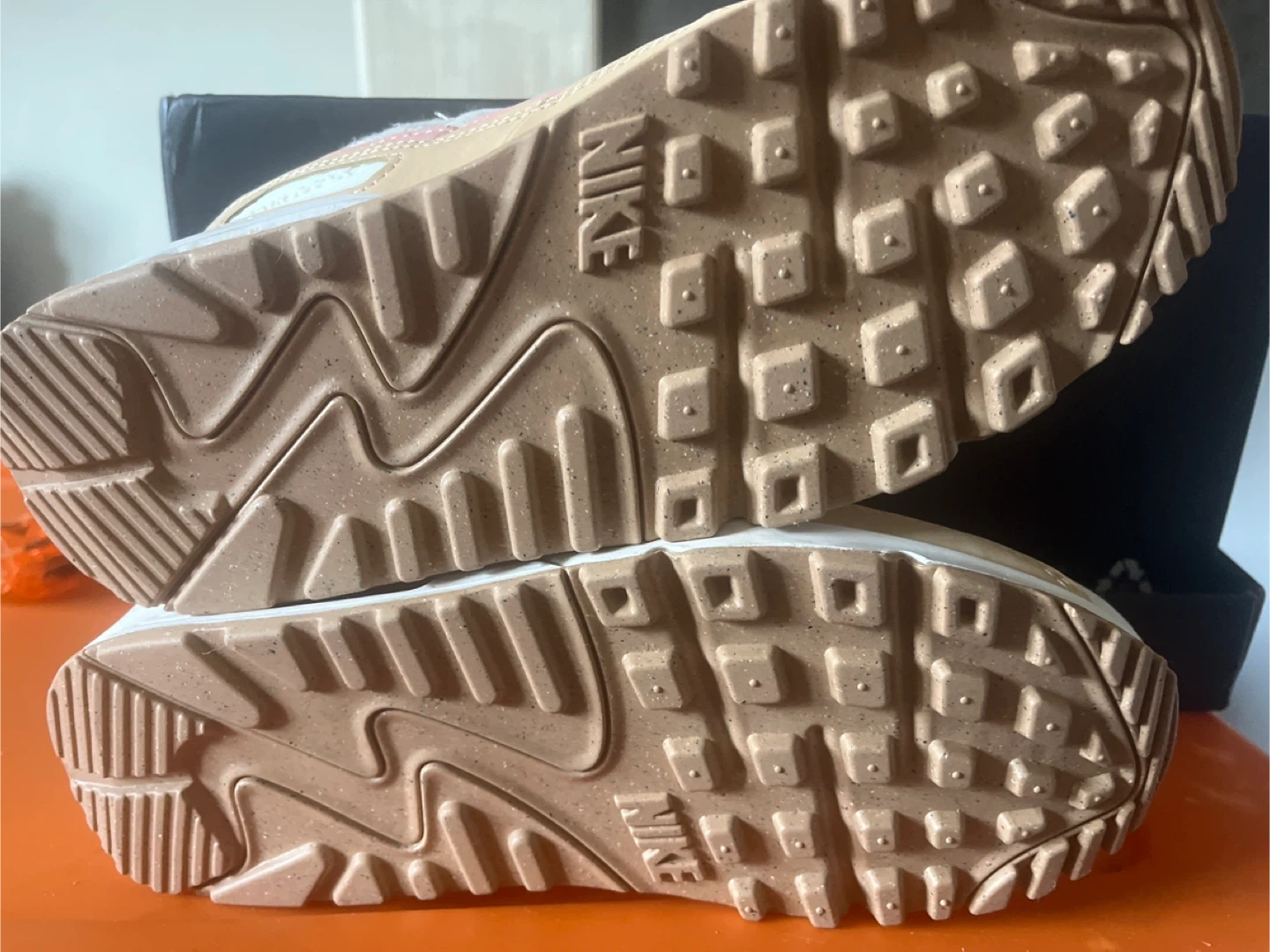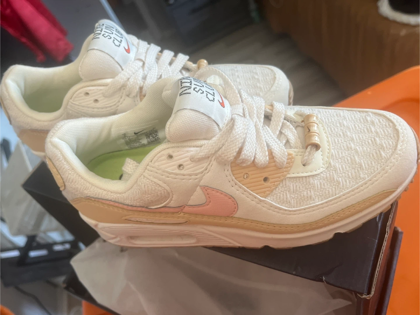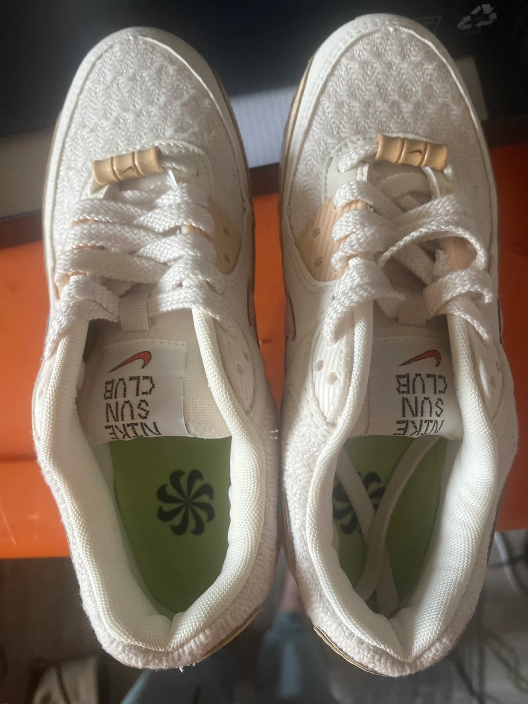 2022 Limited Edition Nike Air Max 90 Women’s sneakers in a cream, tan, and pink colorway. Features the Sun Club branding on the tongue and Air Max details on the heel.