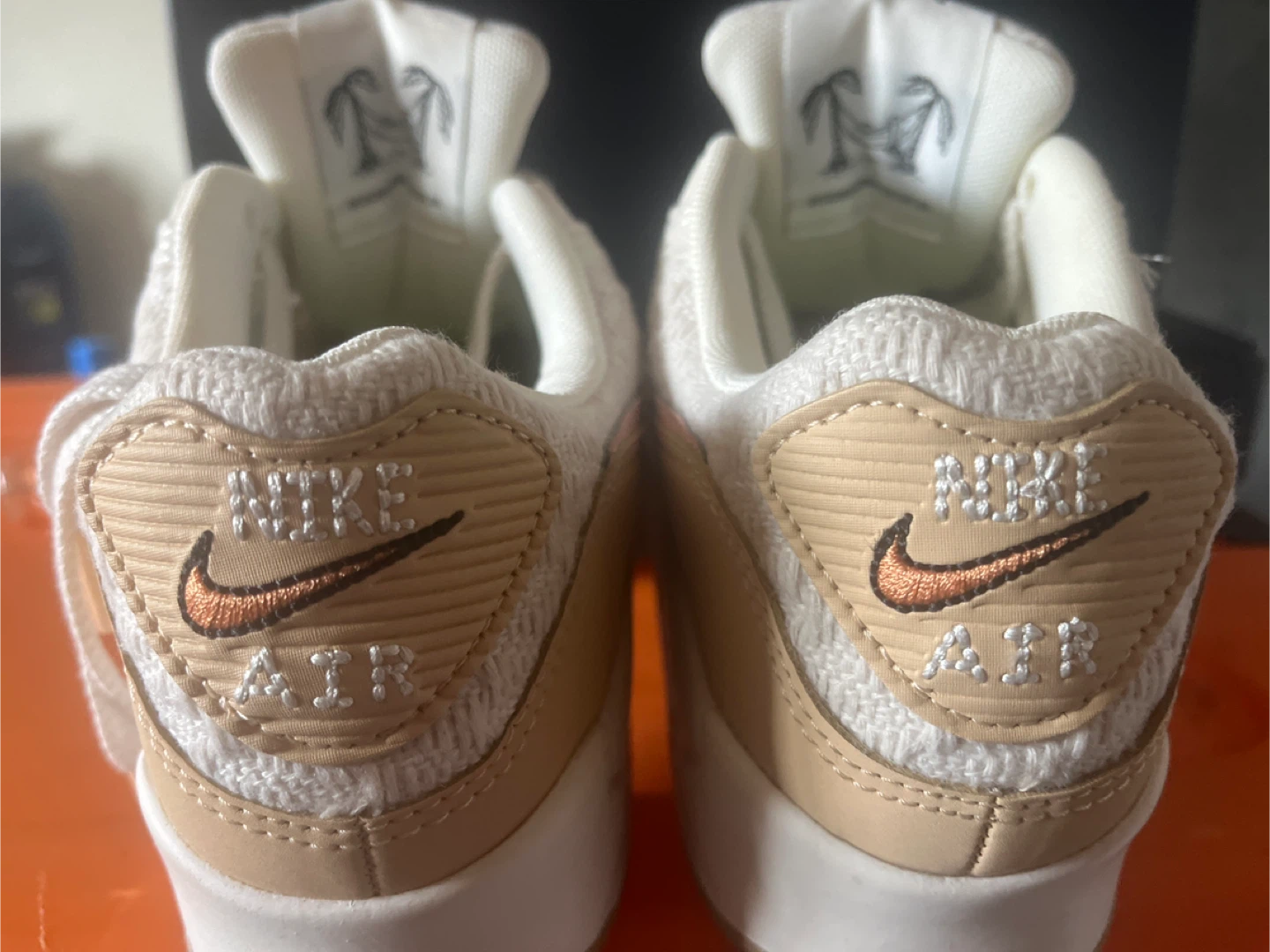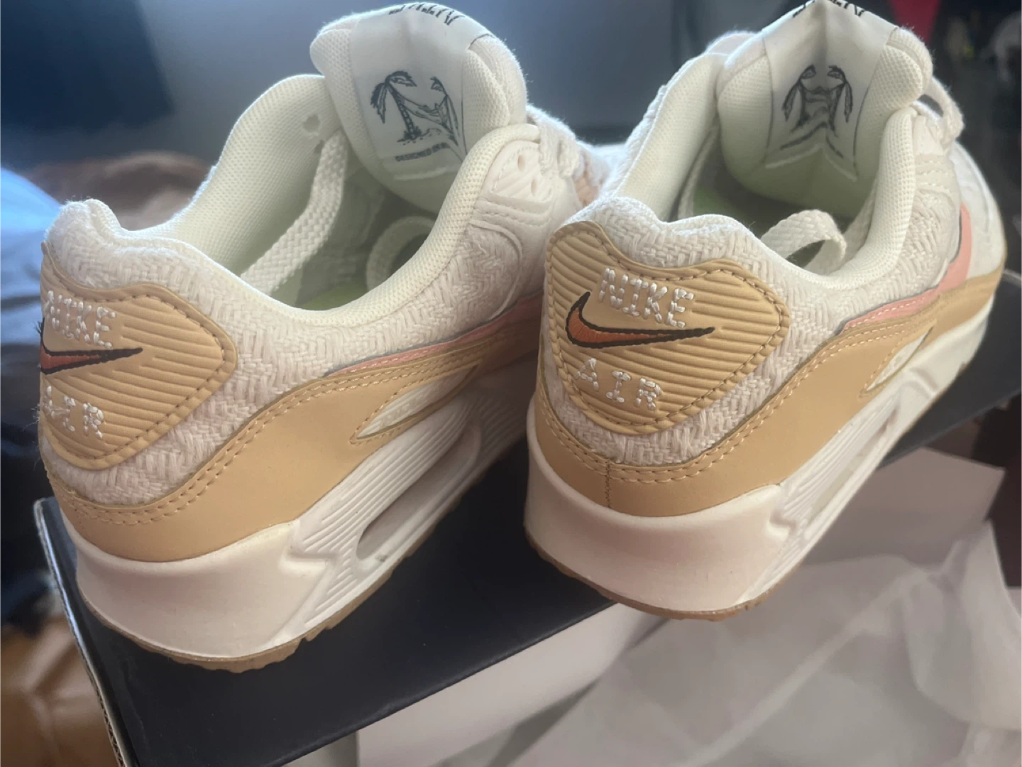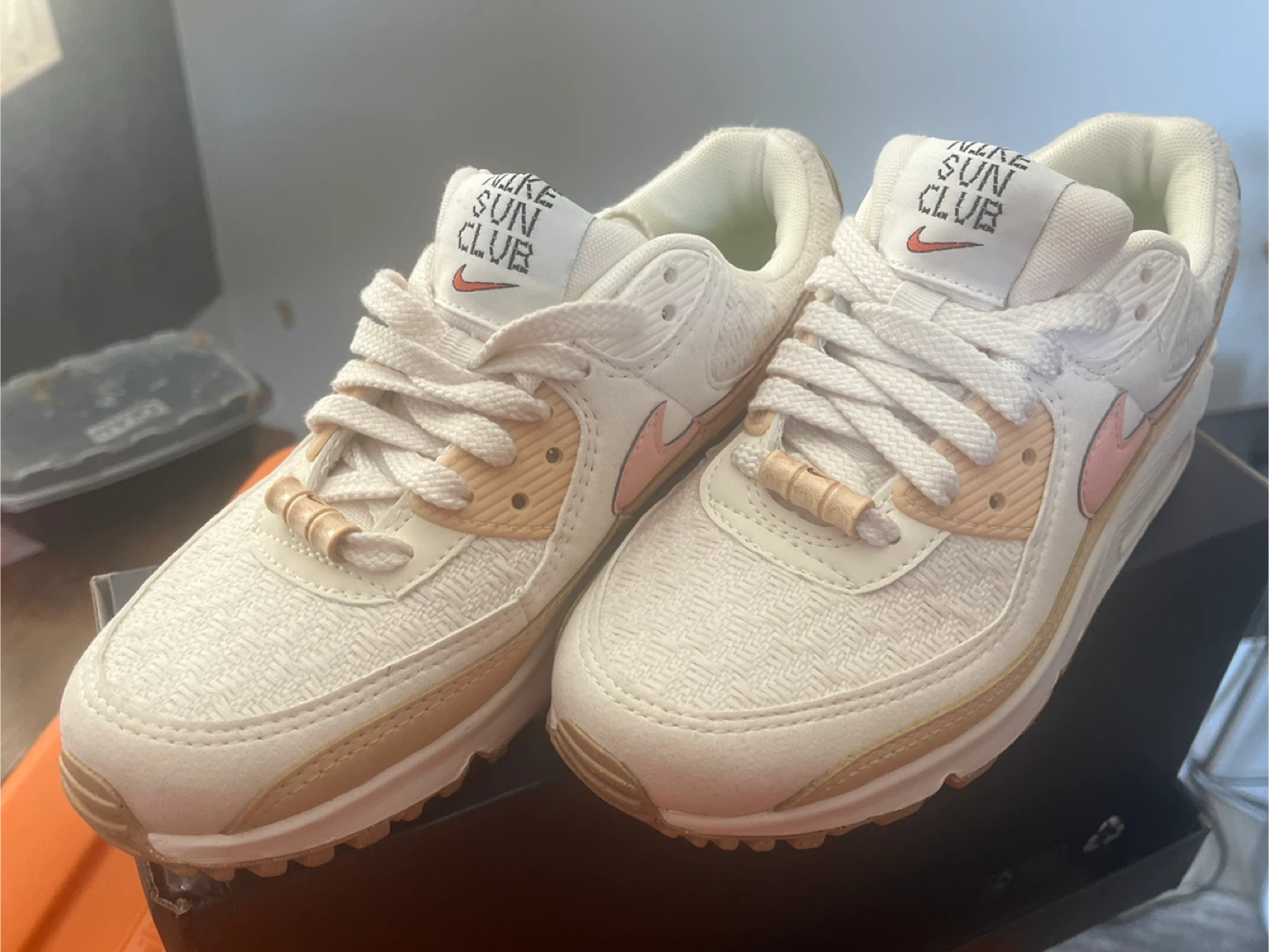 2022 Limited Edition Nike Air Max 90 Women’s sneakers in a cream, tan, and pink colorway. Features the Sun Club branding on the tongue and Air Max details on the heel.