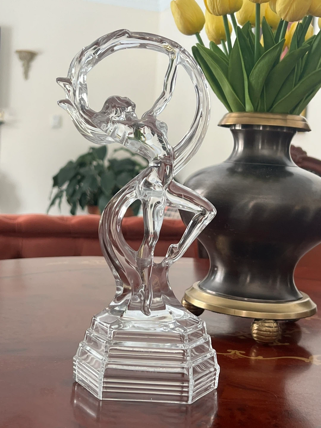 A clear glass figurine depicting a dancer in a graceful pose. It's crafted from transparent glass with a faceted base. This decorative piece would suit any home.