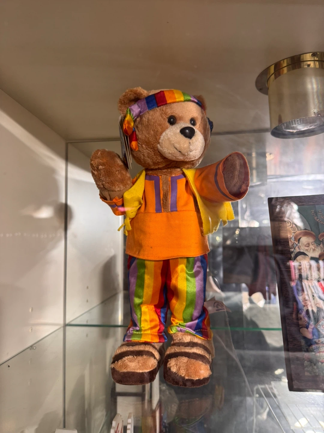 This is a plush teddy bear wearing a colorful rainbow-striped outfit. It has a yellow vest, an orange shirt, and matching striped pants. The bear also sports a rainbow headband. It's a fun and vibrant plush toy!