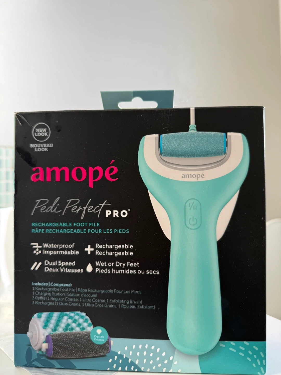 Selling an Amope Pedi Perfect Pro rechargeable foot file! It's waterproof and can be used on wet or dry feet. It has dual speed settings and includes a charging station, plus 3 refills (1 regular coarse, 1 ultra coarse, and 1 exfoliating brush) and 3 recharges (1 gros grains, 1 ultra gros grains, 1 rouleau exfoliant) OBO