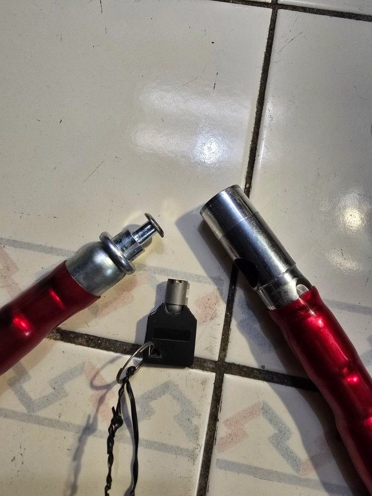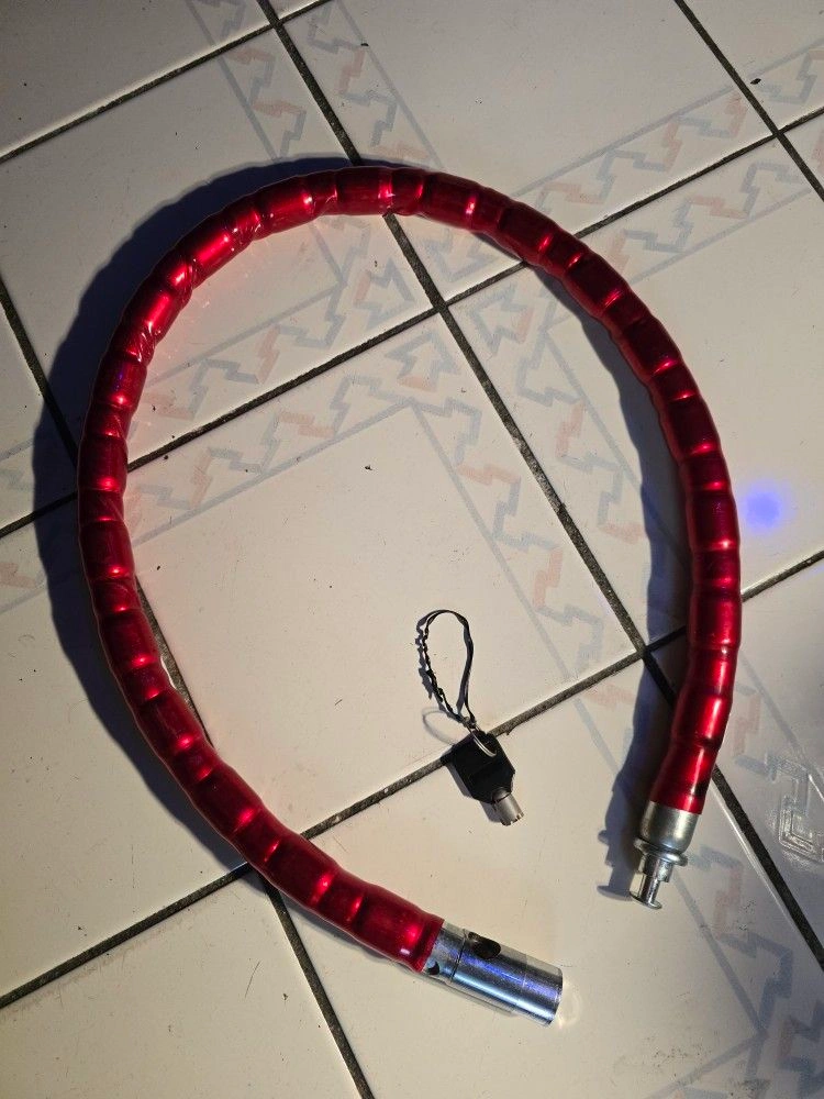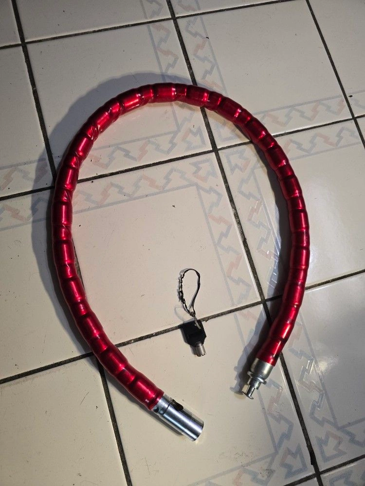 This is an armored cable security lock, typically used for bicycles or motorcycles. It features a flexible inner steel cable protected by steel rollers or an armored steel casing. The lock has a red protective PVC coating to prevent scratching of the secured item. It is designed to be strong enough to protect a bike from theft, offering a balance of security and flexibility. The lock mechanism operates with a key (included). Color: Red. Type: Bike lock. Brand: Unbranded.