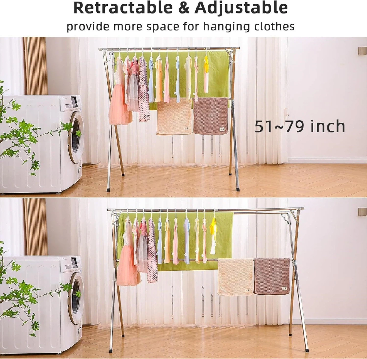 funest Clothes Drying Rack, 79 Inches Adjustable & Foldable Laundry Drying Rack, Heavy Duty Stainless Steel Drying Rack Clothing with 20 Hooks, 12 Clips, Suitable for Indoor, Outdoor and Balcony