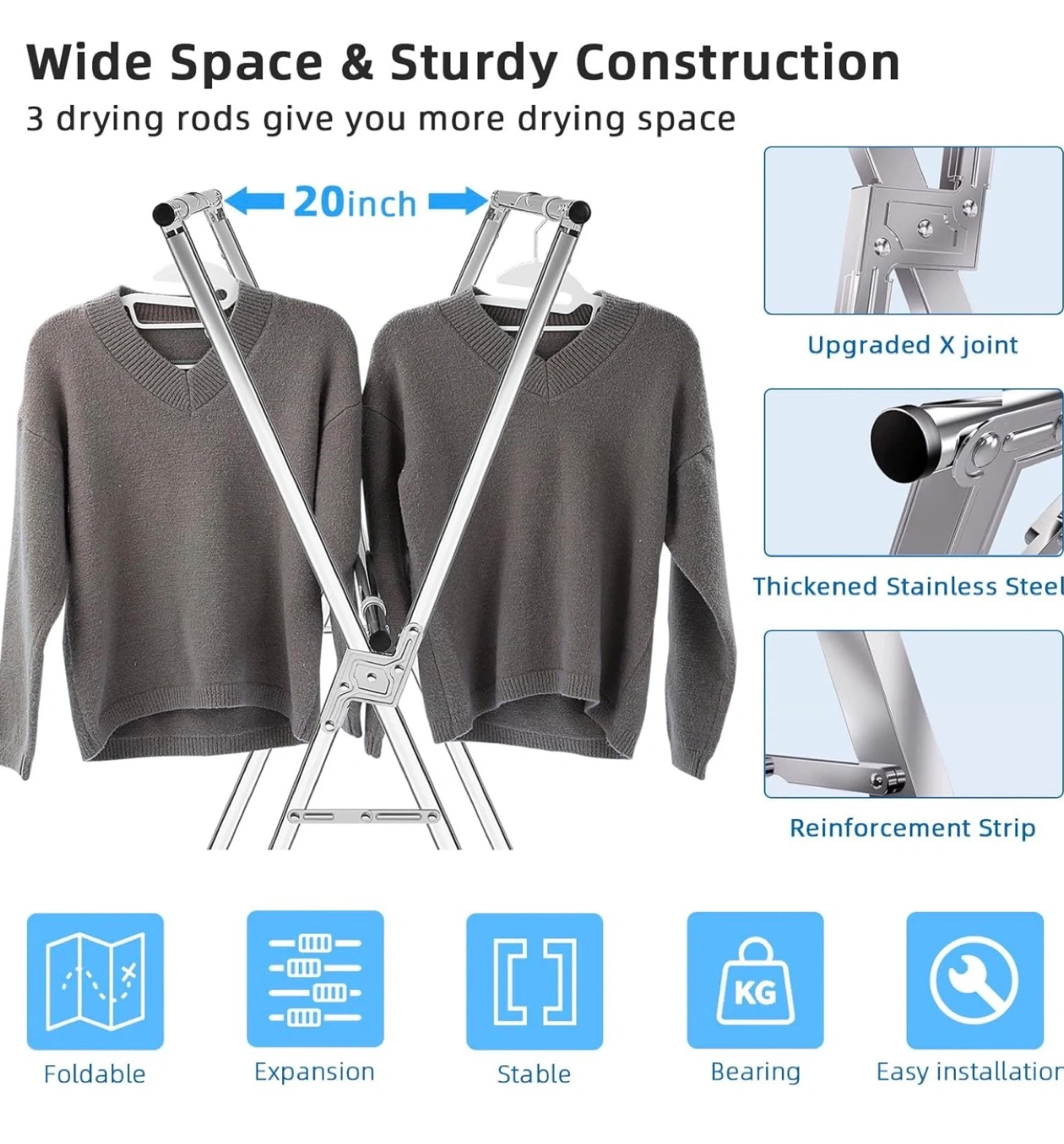 funest Clothes Drying Rack, 79 Inches Adjustable & Foldable Laundry Drying Rack, Heavy Duty Stainless Steel Drying Rack Clothing with 20 Hooks, 12 Clips, Suitable for Indoor, Outdoor and Balcony