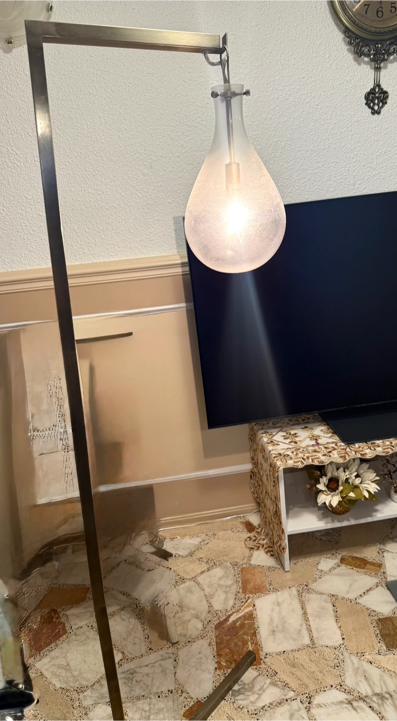 This floor lamp has a sleek, minimalist design with a brushed metal finish. It features a unique frosted glass shade that diffuses light beautifully. Perfect for adding ambient lighting to any room!
