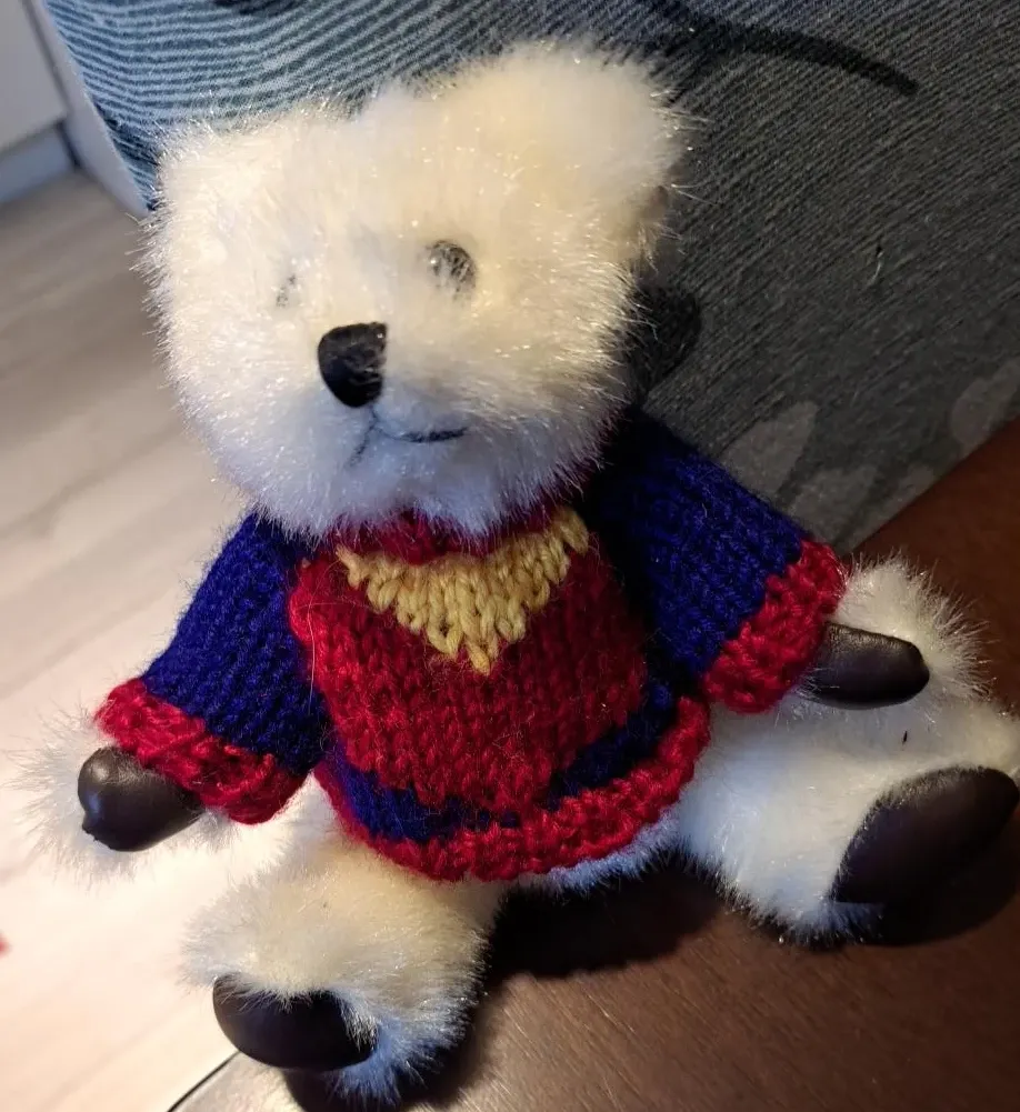 This is a soft white teddy bear. It's wearing a colourful knitted sweater with blue, red, and yellow accents. The bear has dark safety eyes and a black embroidered nose and mouth.