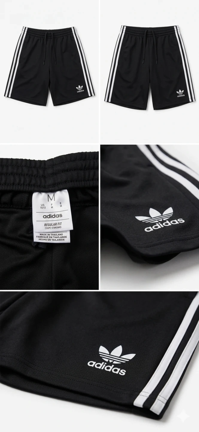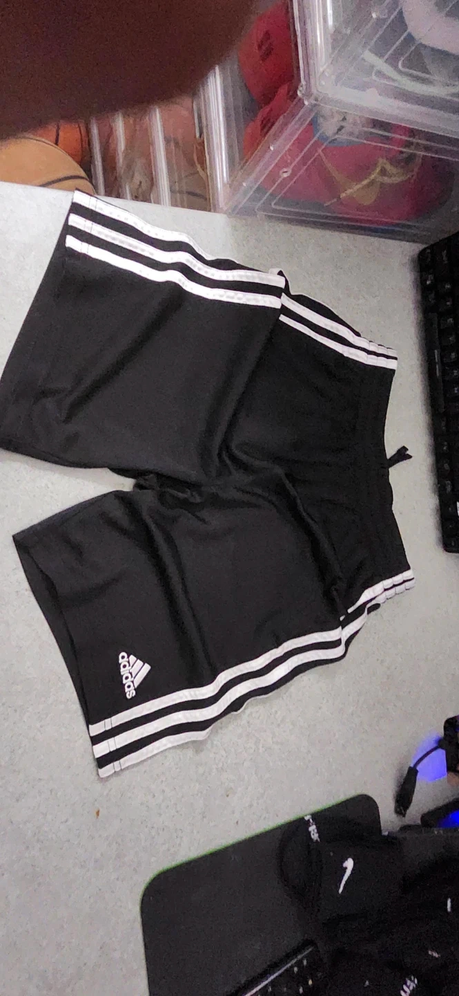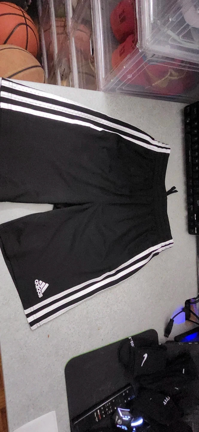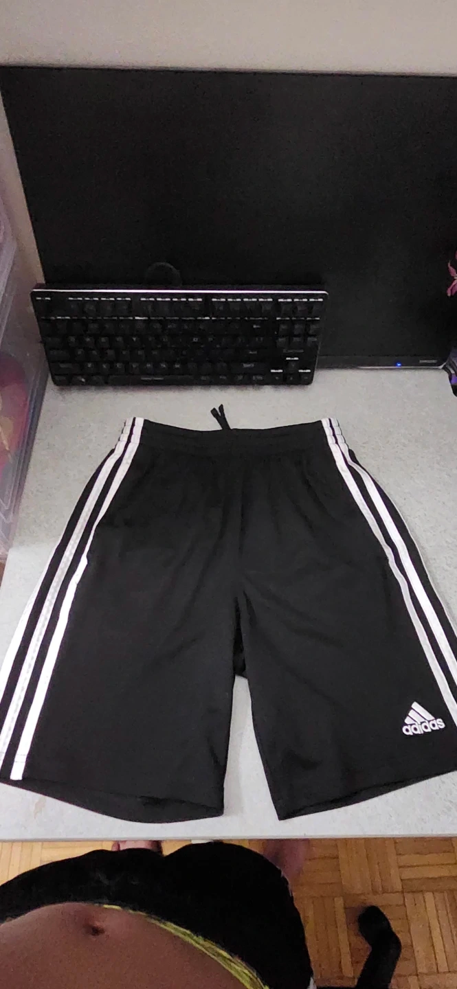 These are black Adidas shorts with white stripes. They're a size medium and made for a regular fit.