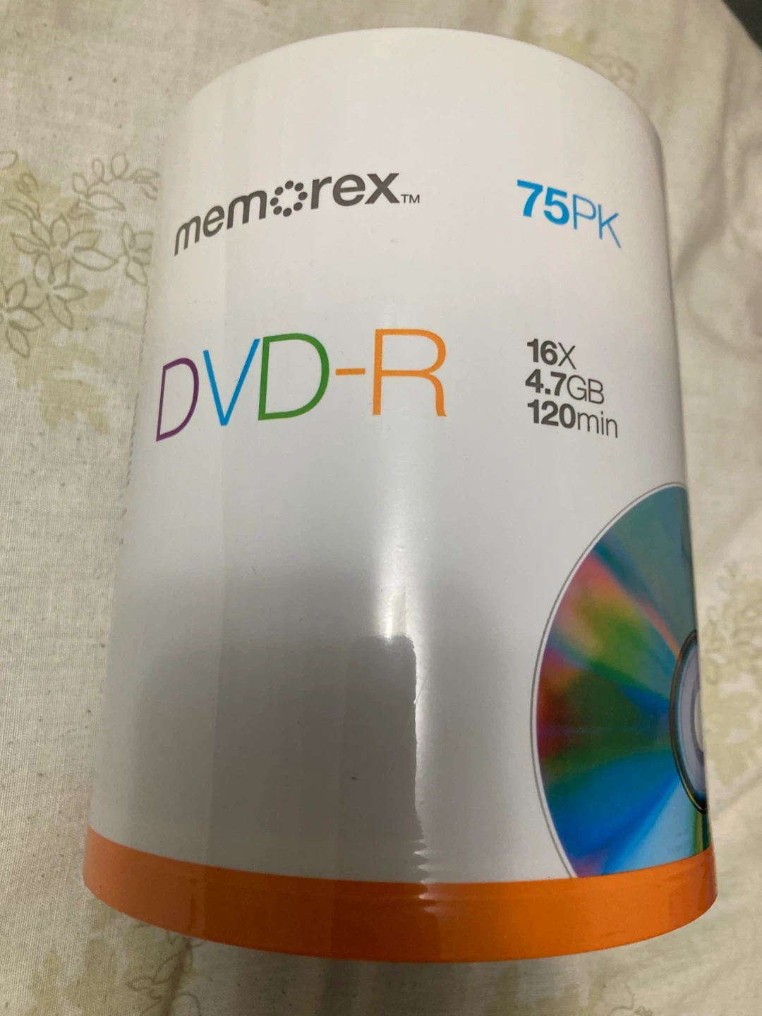 Memorex DVD-R discs in a 75-pack spindle. Each disc has a 4.7GB capacity and a 16x write speed. They can store up to 120 minutes of video.