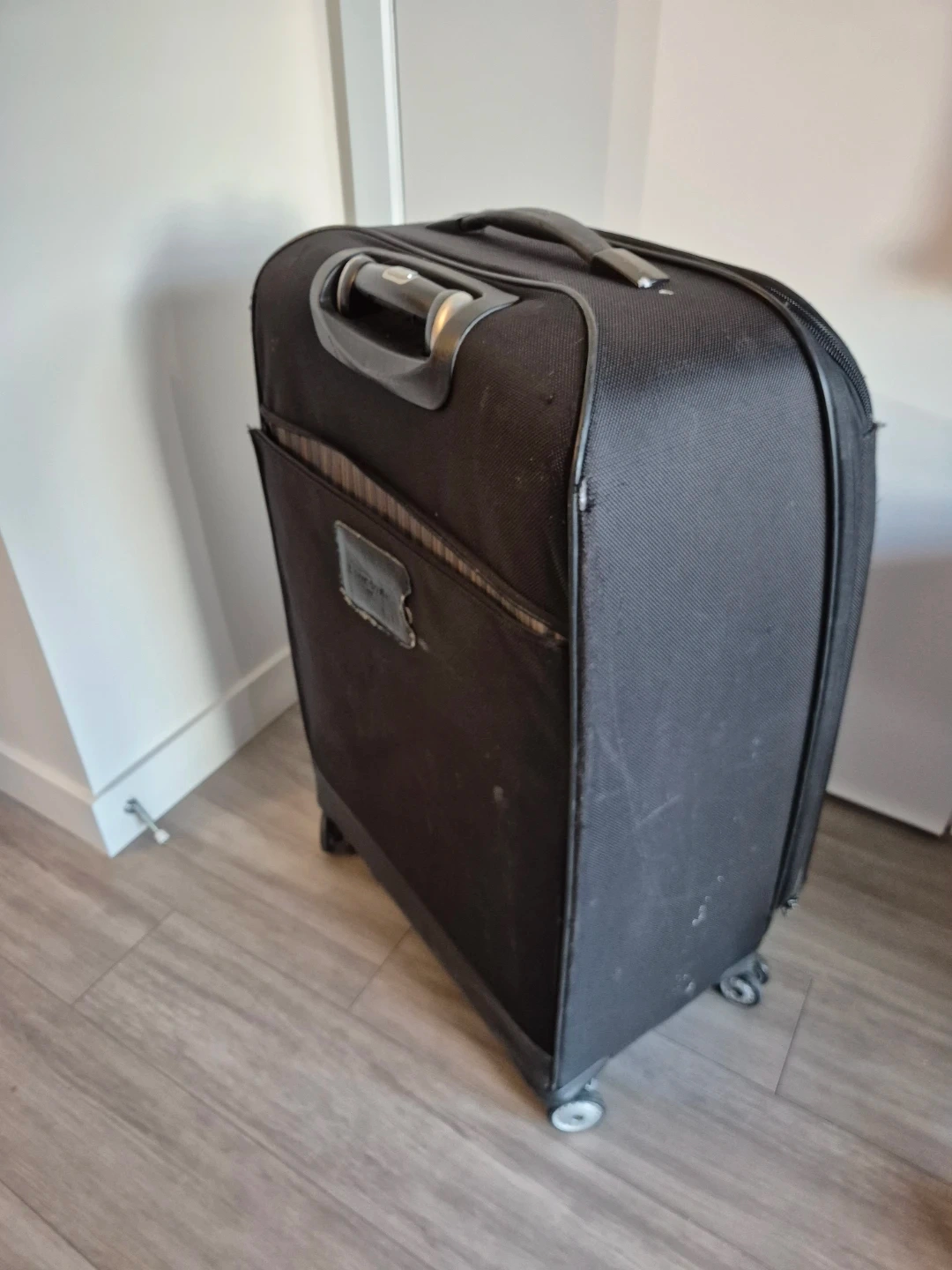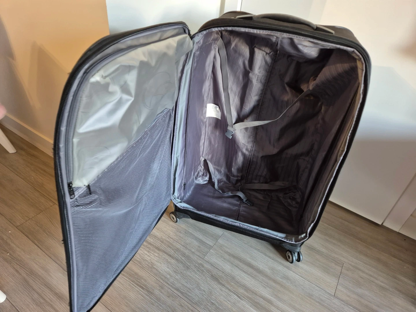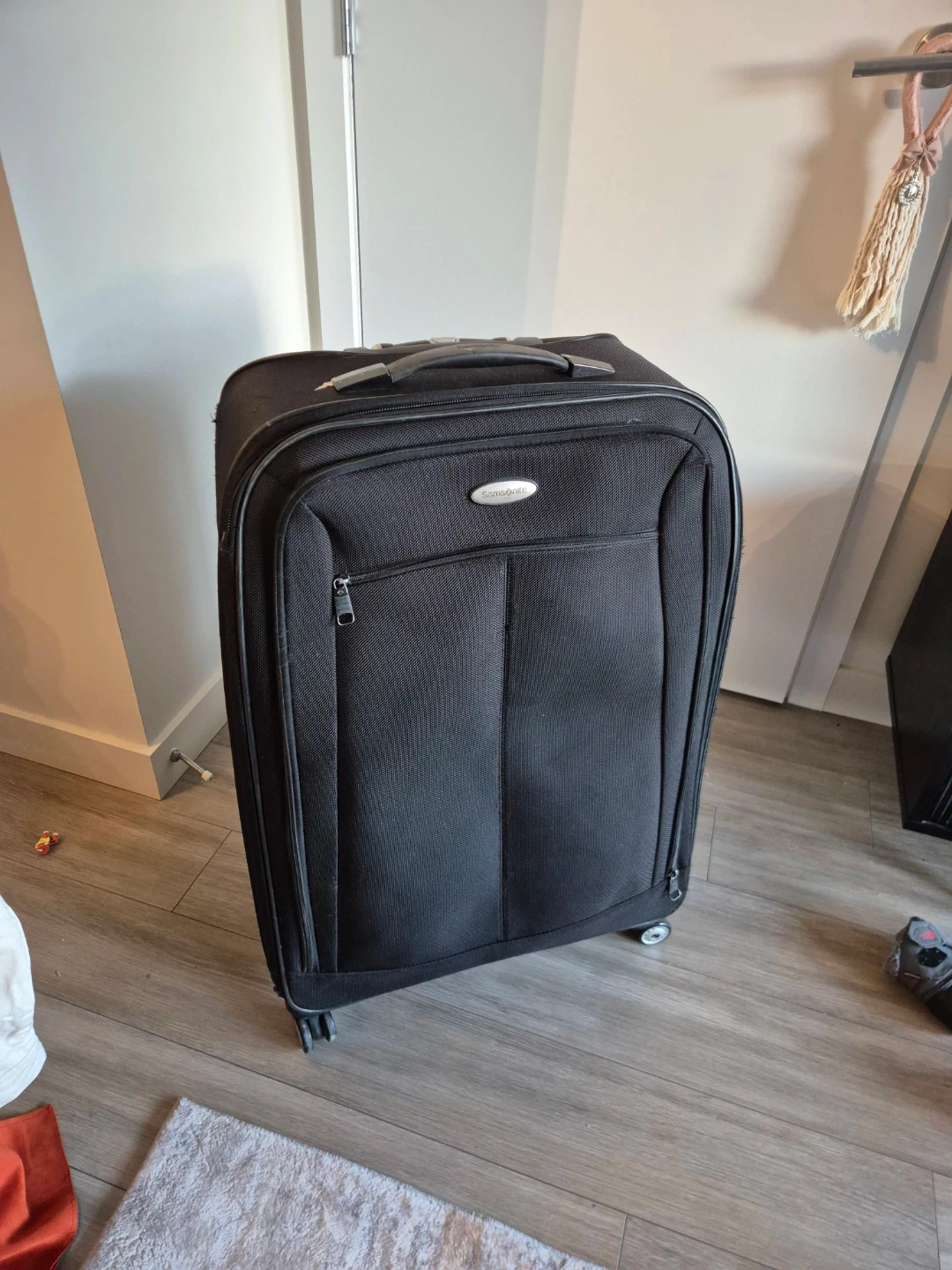 This black Samsonite softside spinner luggage is ready for your next trip. It's a durable and spacious suitcase for all your travel needs. The spinner wheels make it easy to manoeuvre through airports. Great for weekend getaways or longer vacations!