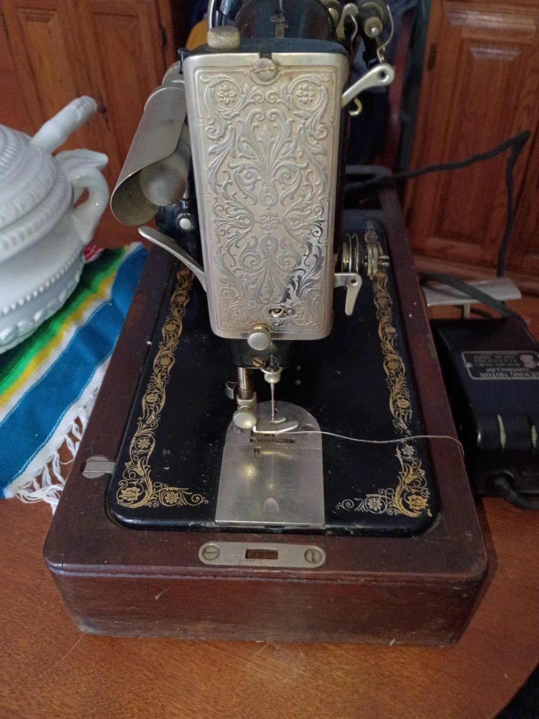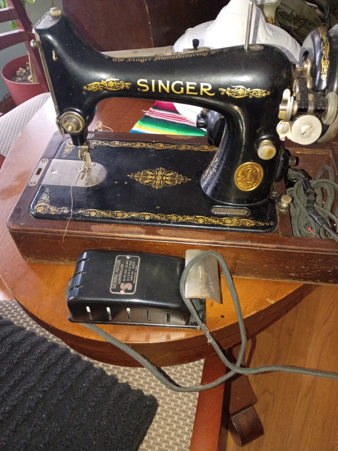 This is a vintage Singer sewing machine with a wooden case. It includes the sewing machine, a foot pedal, and a power cord. It's a classic piece for collectors or for use! It works perfect and the graphics are in great condition