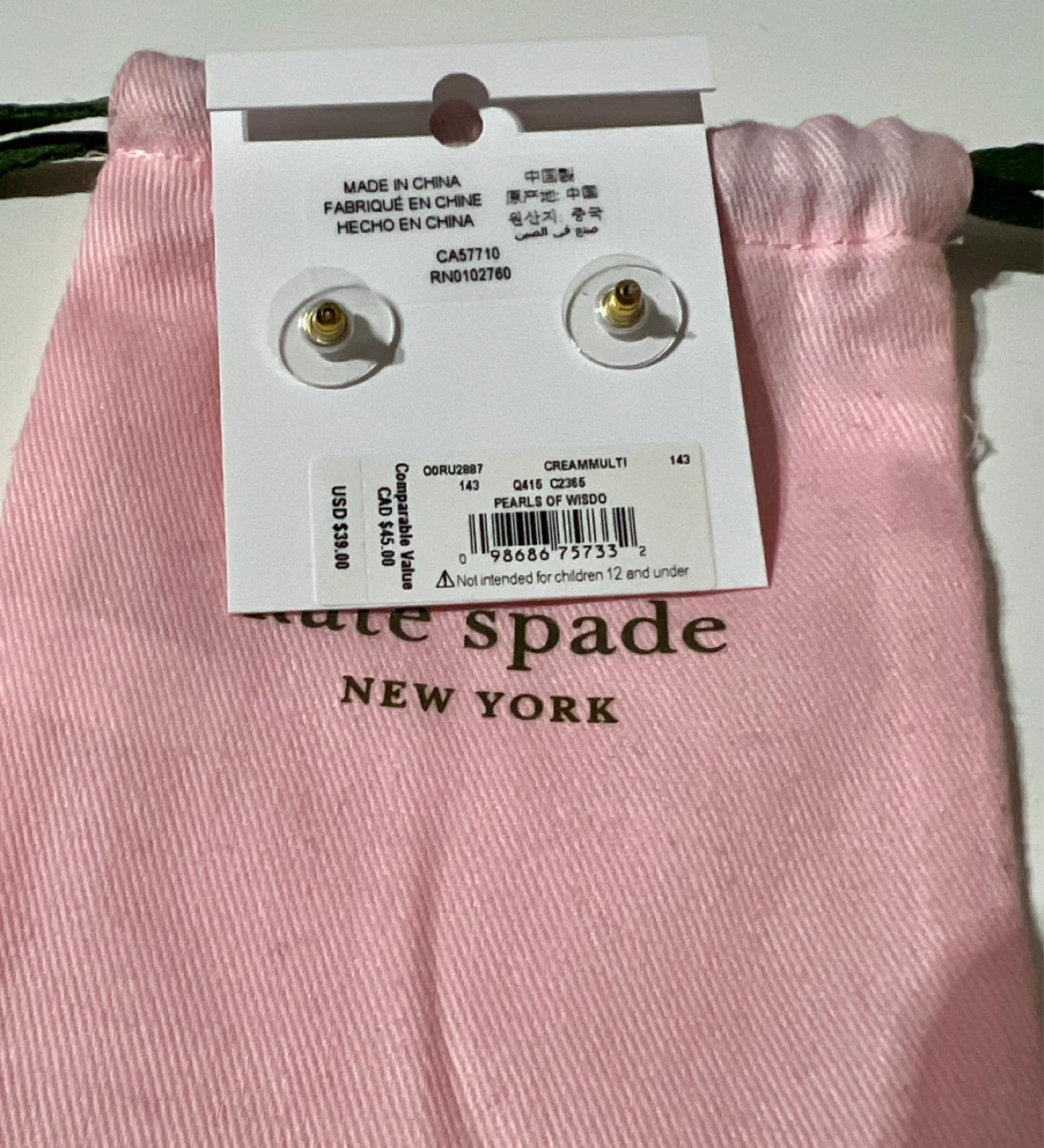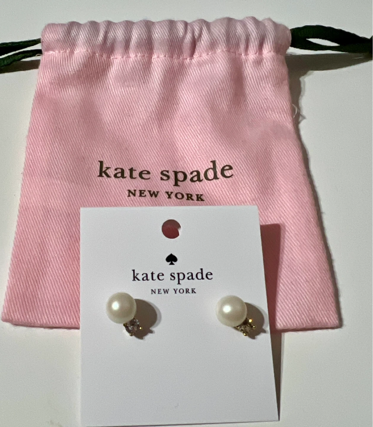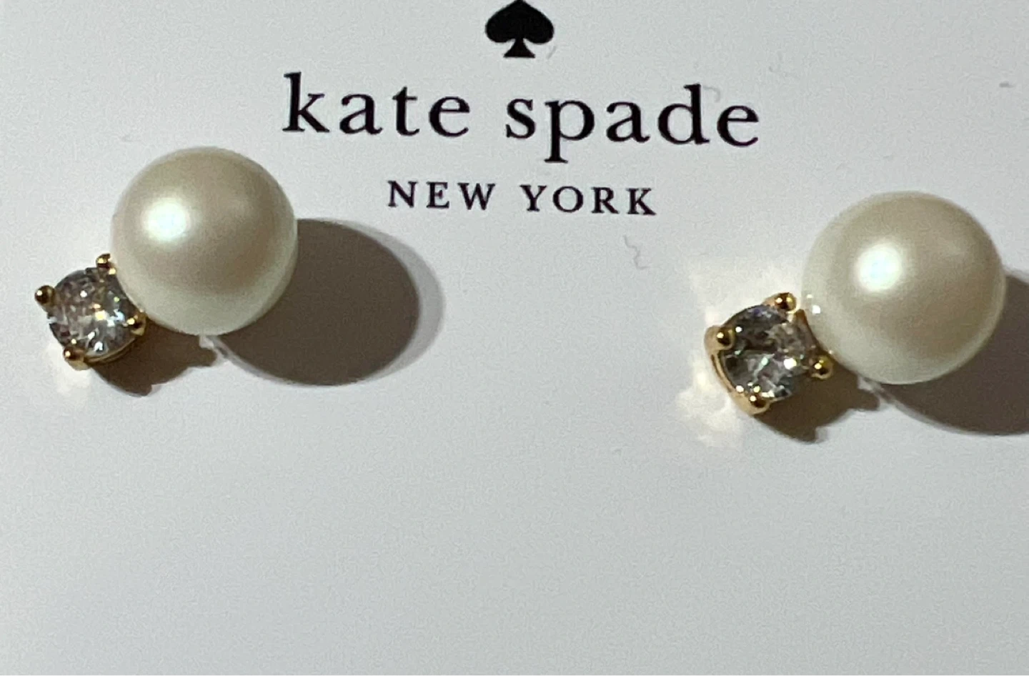 These are Kate Spade New York stud earrings. They feature a pearl with a sparkling crystal accent. Comes with a pink Kate Spade pouch.
