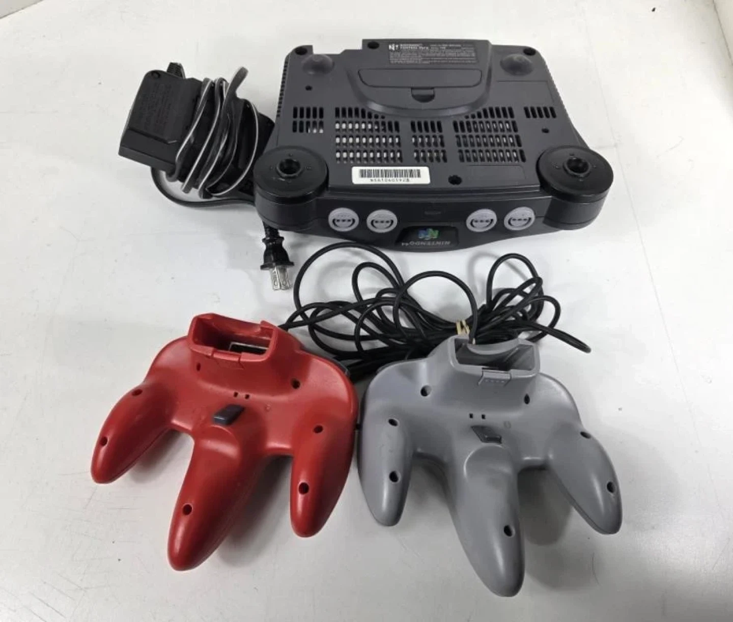 This is a Nintendo 64 console bundle. It includes the N64 system, two controllers (one red, one grey), and an AC adapter. Five game cartridges are also included: Diddy Kong Racing, 007 GoldenEye, Star Fox 64, Super Mario 64, and NHL 99. A great setup for retro gaming enthusiasts!